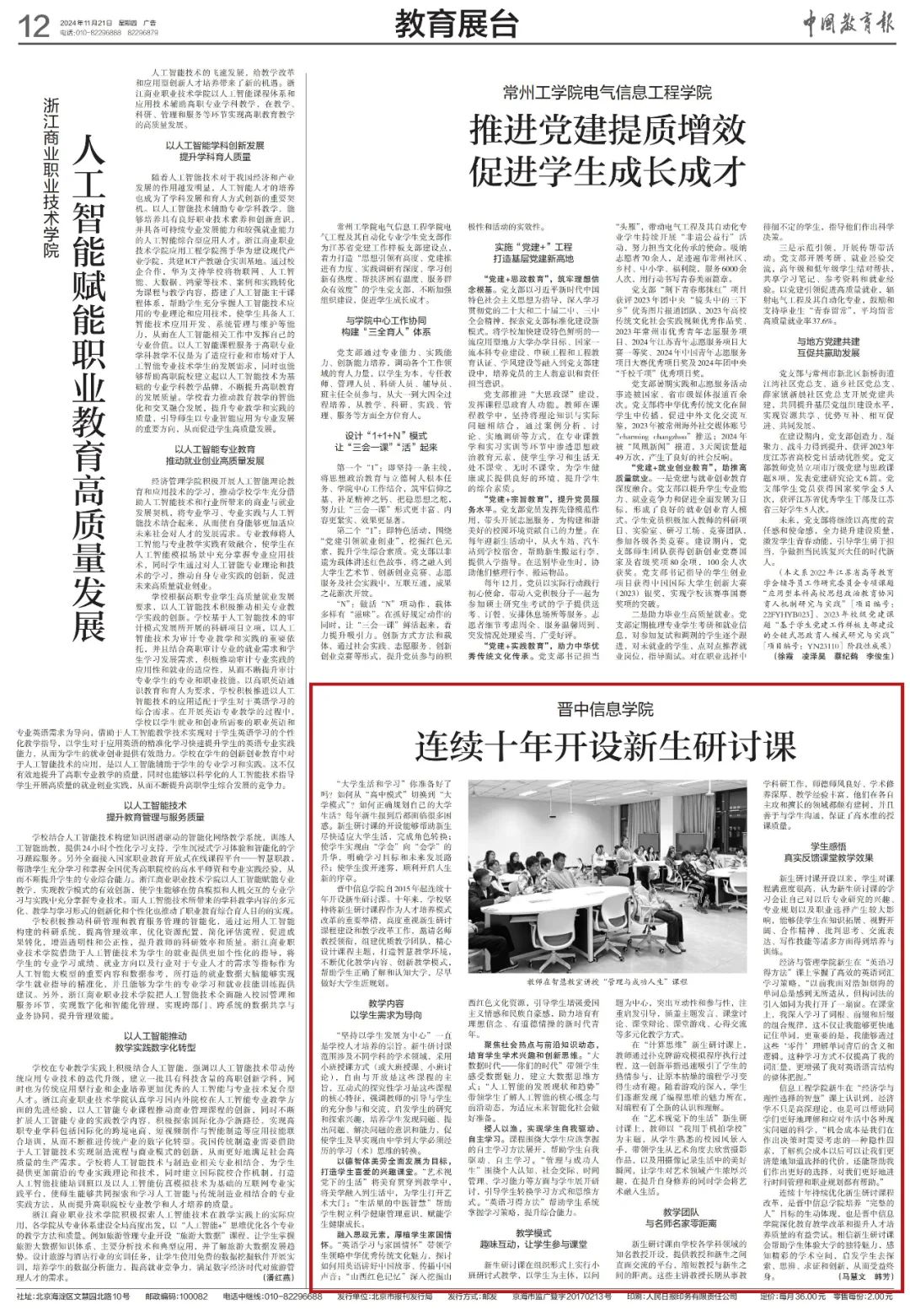 学校自2015年起连续十年开设新生研讨课。十年来,学校坚持将新生研讨课程作为人才培养模式改革的重要举措,高度重视新生研讨课程建设,邀请名师教授领衔,组建优质教学团队,精心设计课程主题,打造智慧教学环境,不断优化教学内容、创新教学模式,帮助学生正确了解和认知大学,尽早做好大学生涯的规划。2024年9月,《一所与众不同的大学》等8门新生体验课和40门新生研讨课陆续亮相开讲,70余名资深教师和行政骨干人员、部门领导将带领7800余名2024级新生充分认识和感受大学学习生活,帮助他们开启未来四年大学生活的探索和追求。