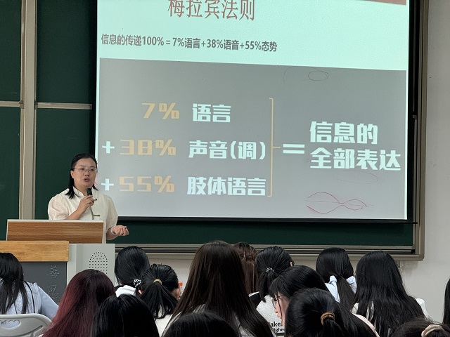 讲座中,安老师帮助同学们解码了信任公式,提出了从“术”到“道”的实践路径——“信任金字塔”模型。她将构建过程拆解为三个层级:基础层,可信形象塑造;能力层,专业与共情并重;价值层:长期主义信用账户。安老师指出,“首因效应决定55%的信任基础。”通过现场演示,安老师向同学们解释了梅拉宾法则,并展示了非语言行为的管理技巧。如保持0.8秒的适度眼神接触、开放型肢体语言(如双臂不交叉)、语速与对方呼吸频率同步等细节。通过非语言行为的管理,传递“安全信号”。安老师引用麦肯锡“可信度矩阵”,告诫同学们专业能力是信任的基石,共情能力让我们能够站在他人的角度理解需求、感受和顾虑。