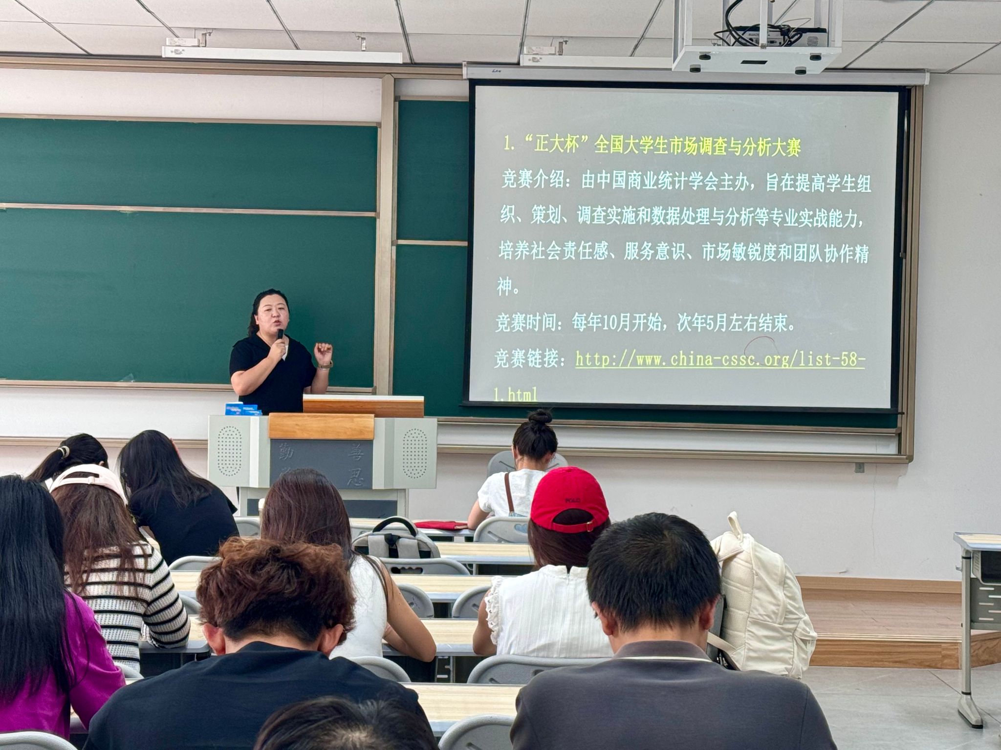 接着,庞老师详细介绍了市场营销专业可以参与的几项重要学科竞赛,包括“正大杯”全国大学生市场调查与分析大赛、全国高校商业精英挑战赛品牌策划竞赛等。她不仅阐述了各项竞赛的背景、目的和意义,还分享了往届获奖作品的亮点和特色,为同学们提供了宝贵的参考和启示。