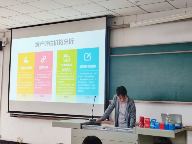 吴涛老师向同学们简单介绍了资产评估所涉及的领域,例如:农业、林业、畜牧业、工业、服务业等,都是资产评估工作中需要接触到的。吴涛老师还说:“资产评估工作将会有许多外出机会,出差期间会接触到全世界不同的地方,在工作闲暇时就能实现在全世界游玩的愿望。”吴涛老师还给予了同学们关于资产评估工作的短期、中期以及长期计划,并提到了报考初级会计师、注册会计师以及资产评估师三个证书对于从事资产评估工作的重要性,热切的询问了是否有同学报考,不少同学表示已经报考或者已经考过初级会计师证书。