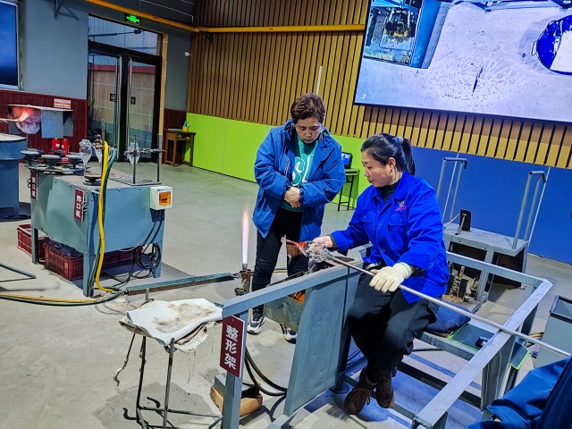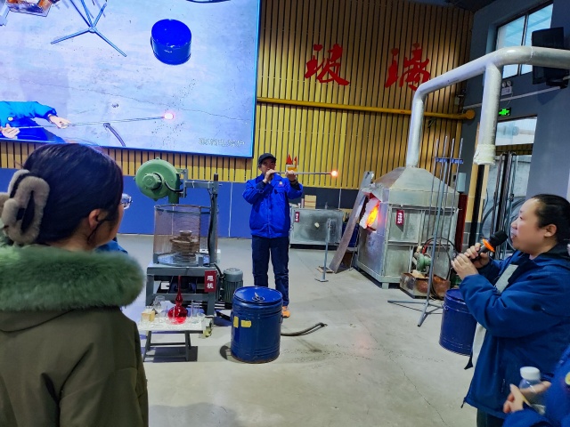 随后,一行人走进了玻璃工匠非遗展示馆。在这里,他们亲眼目睹了玻璃工匠们精湛的技艺和专注的神情。从选材、熔炼、吹制到成型,每一步都凝聚着匠人们对玻璃艺术的热爱与执着。这些非遗传人不仅传承了古老的玻璃制作工艺,还在此基础上不断创新,赋予了玻璃艺术新的生命。
