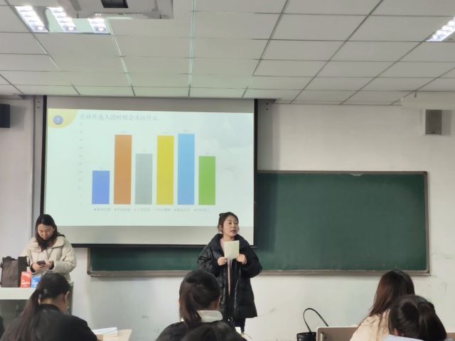 任课教师刘潇老师为同学们揭晓了神秘高管教师的身份:这位老师正是来自山西光明图文系统有限公司副总兼工会负责人贾红燕老师,她拥有着丰富的人事与行政、组织培训、校企合作、运营等方面的经验。