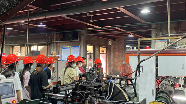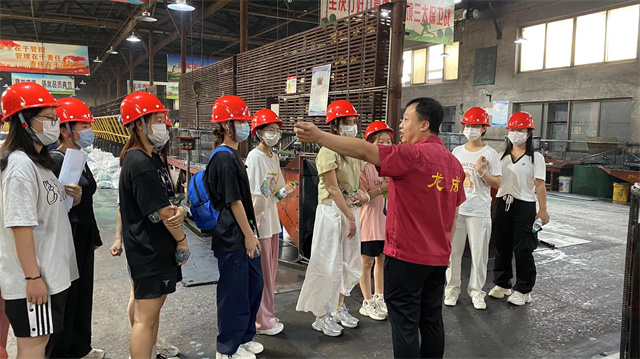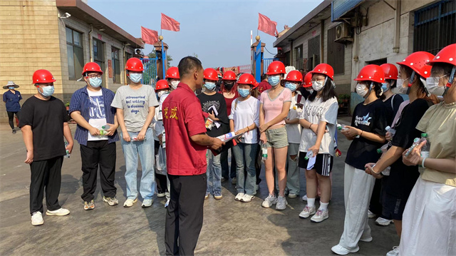 晨光初照的清晨,在张娟老师和苗咏丽老师的带领下同学们满怀激情与憧憬的踏上了他们实习认知实践的征途,目的地是历史悠久的山西龙成玛钢有限公司。一踏入这片钢铁铸就的天地,工厂的工作人员就安排同学们分成三组依次进入,迎接他们的是工作人员准备的一排排整齐的安全帽和矿泉水,每一顶安全帽都承载着对安全的承诺与守护。同学们都规规整整带上了安全帽,工作人员也贴心的告诉了大家注意事项。在工作人员的带领下依次进入厂房参观。