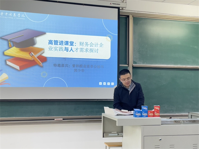 活动伊始,特邀嘉宾紫林醋业董事会秘书郭少春发表了致辞。他提到,财务会计作为商业世界的基石,其重要性不言而喻。随着大数据、云计算等新兴技术的不断涌现,会计行业的面貌正在发生深刻变革,为从业人员带来了前所未有的机遇和挑战。因此,了解企业实践中的财务会计需求,对于培养符合市场需求的高素质人才具有重要意义。
