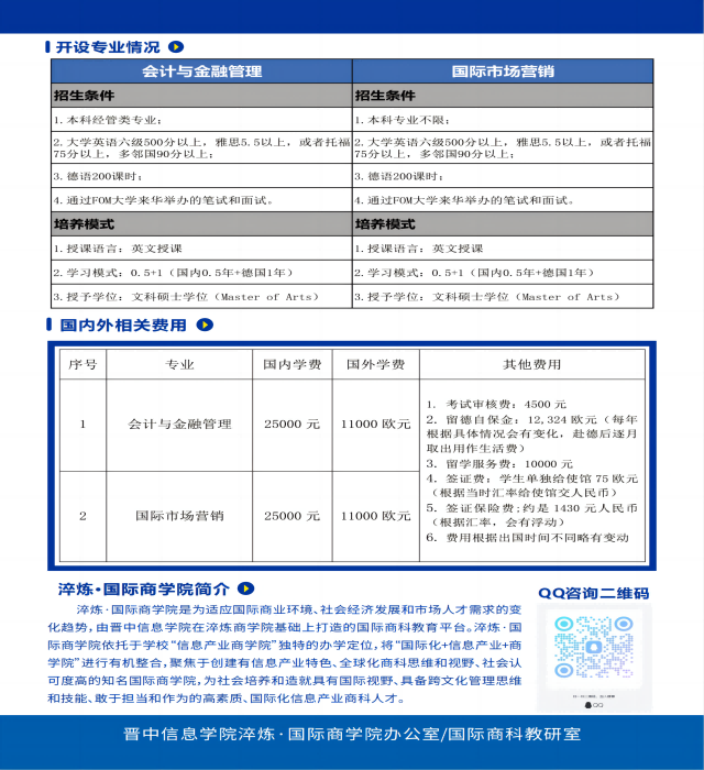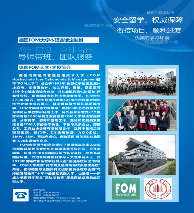 淬炼•国际商学院为适应国际商业环境、社会经济发展和市场人才需求的变化趋势,与德国埃森经济管理应用技术大学(FOM Hochschule fuer Oekonomie & Management简称“FOM大学”)进行校际合作,联合培养硕士,为社会培养和造就具有国际视野、具备跨文化管理思维和技能、敢于担当和作为的高素质、国际化信息产业商科人才。