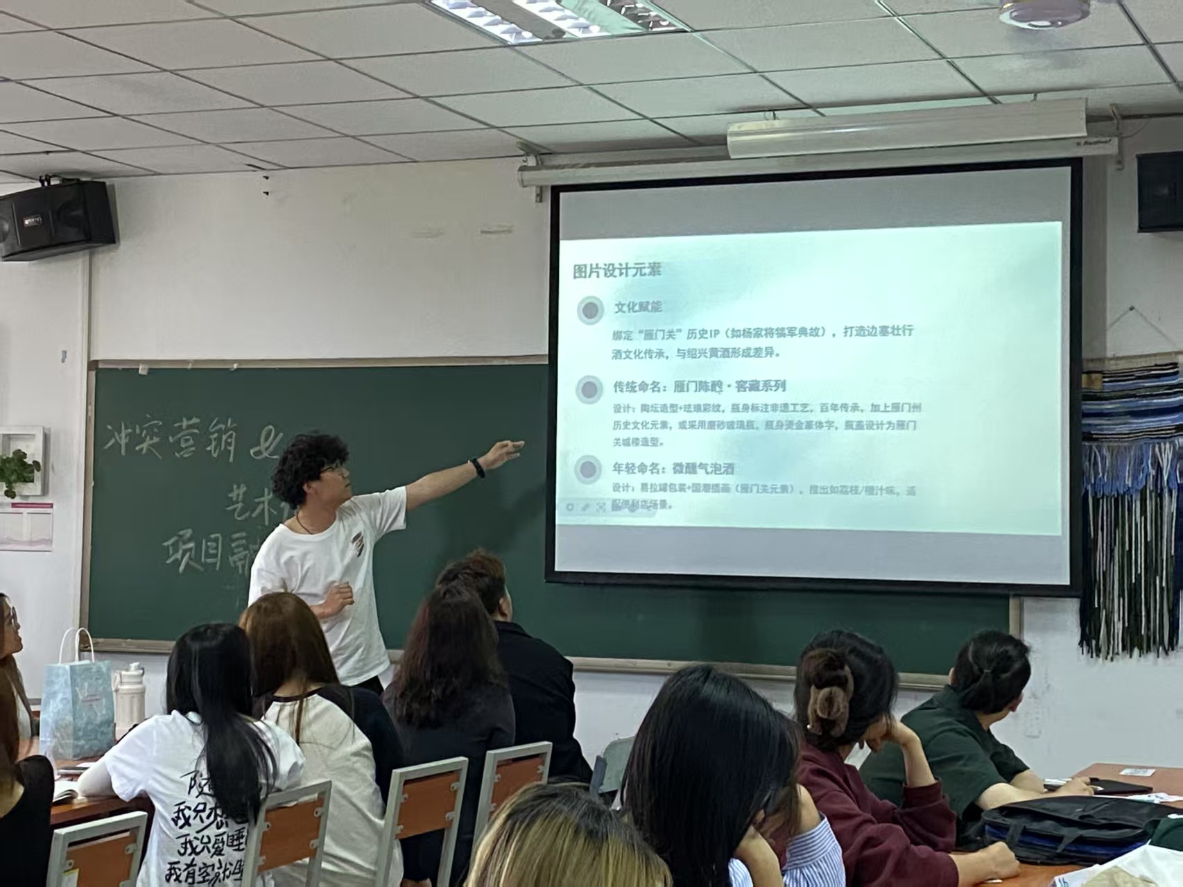 当百年黄酒邂逅先锋设计,当冲突营销碰撞东方美学,一场关于传统产业突围与文化基因再生的创新实验正在校园上演。2025年5月12日,冲突营销学院精英班项目小组走进艺术传媒学院品牌与策划课堂,围绕“老高家黄酒”品牌升级与包装焕新展开深度共创。艺术传媒学院视觉传达设计专业教师刘静老师主持会议,冲突营销学院项目导师杨艺敏携精英班项目小组成员,与视觉传达设计专业学生共同解码黄酒文化传承的“破圈密码”。