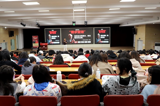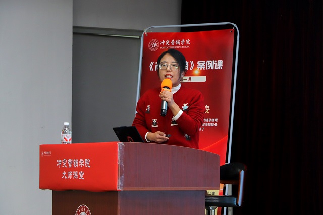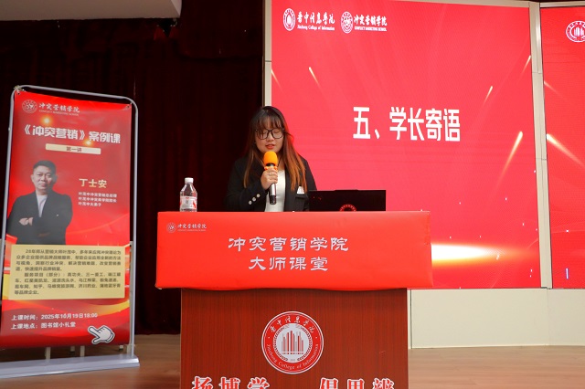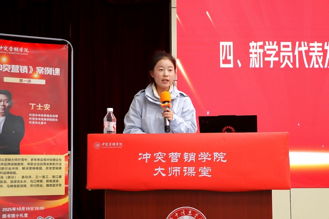 在学员代表发言环节,第三期实训班学员唐明珠上台,用诚恳、质朴且热情洋溢的话语,分享了自己对冲突营销学习的期待,以及将全力以赴投入实战的决心。接下来的学长寄语环节充满温情,首届优秀毕业学员、现身处广州的学长张靖哲通过视频送上祝福,分享自己的学习与职场经验;第二期精英班优秀学员任晋同学则亲临现场,结合自身实训经历为新学员提供建议,让新学员们感受到了学院温暖的“传帮带”氛围。