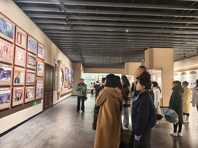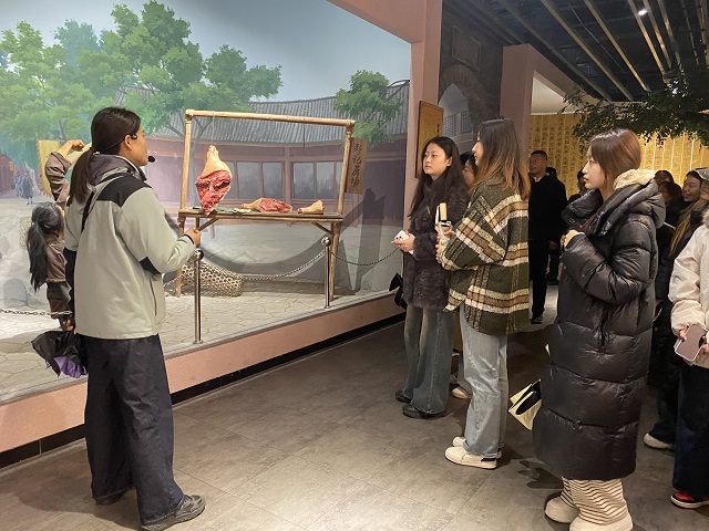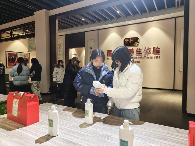 紫林醋工业园坐落于“中国醋都”清徐县,是山西老陈醋的发源地。师生一行首先参观了三晋醋苑主题展览馆,该馆建筑面积达3000平方米,通过序厅、世界醋史、贯中堂、紫林印象、醋乐汇五大篇章,系统展示了醋的历史文化底蕴。在制醋车间,学生们见证了传统工艺与现代技术的完美融合。醋酸发酵采用手工翻缸与机械化发酵相结合的方式,自主研发的翻醅机工作效率相当于30名工人,57米长的发酵池仅需半小时即可完成翻醅,彰显了工业化生产的巨大优势。陈酿车间展示了山西老陈醋“蒸、酵、熏、淋、陈”五大核心技艺。通过“夏伏晒、冬捞冰”的陈酿工艺,经过12个月以上的陈酿期,四斤原醋才得一斤成品,让学生们深刻体会到“愈陈愈香”的品质追求。