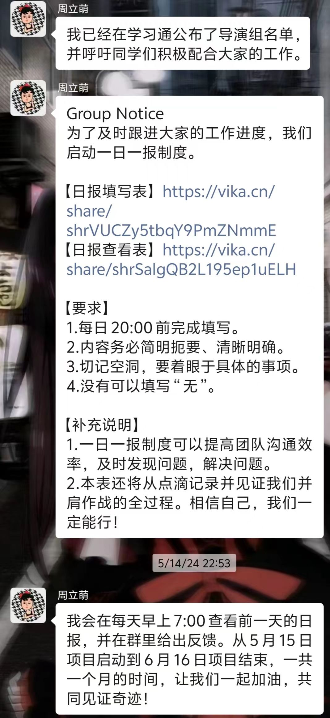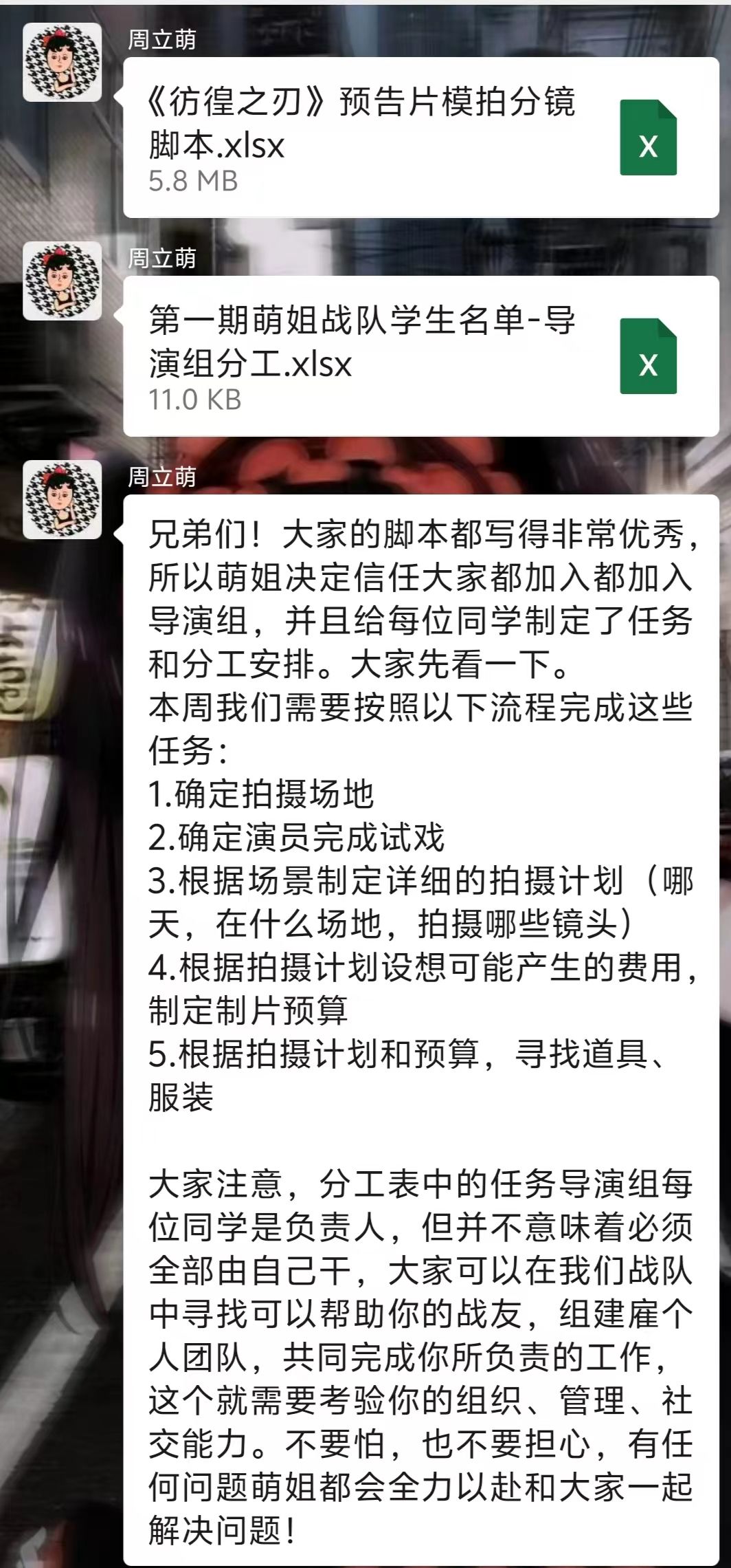 周立萌老师在拍摄初期做了许多准备工作,从开始与同学们一起撰写电影拍摄脚本,到导演组的各类分工,再到制订一日一报的反馈制度,持续对片子进展进行跟进,为最终的成片打下了坚实的基础。