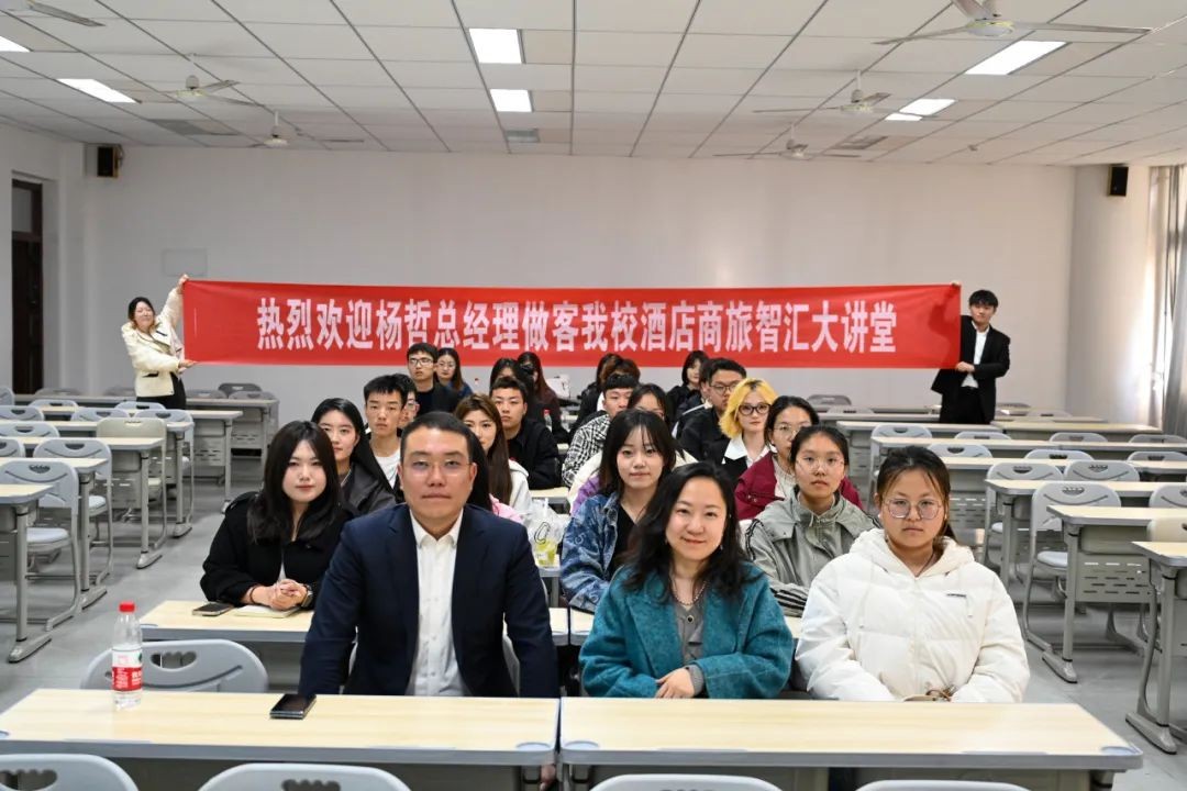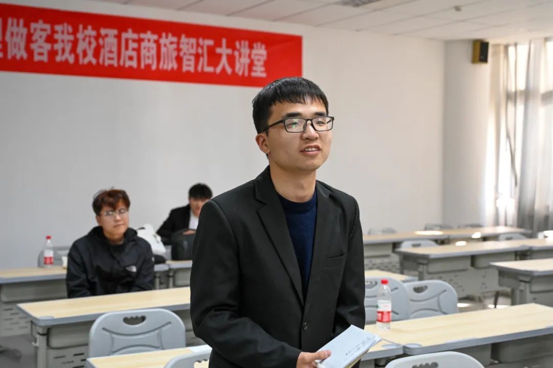 讲座开场,主持人介绍了讲座的目的与议程,特别点明从总裁视角剖析酒店行业未来走向的重要意义,一下子就抓住了同学们的注意力。紧接着,山西新青龙大酒店总经理杨哲先生受邀登台发表开场讲话。杨哲先生作为一名预备党员,毕业于湖南科技大学,在酒店行业深耕多年,履历堪称丰富。他曾在浙江开元酒店集团、山西丽华大酒店等多家知名企业担任从基层管理到高层决策的多个重要职位,还参与投资珠海公寓式酒店,同时担任珠海市山西商会理事。