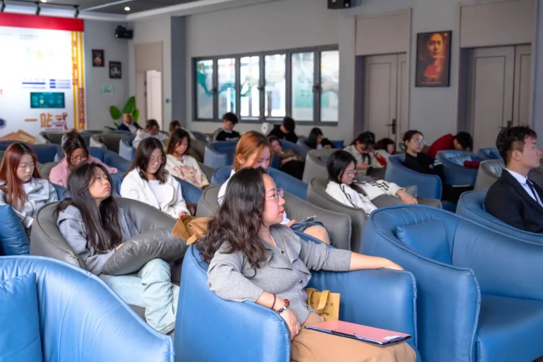 紧接着,主持人隆重介绍了本次讲座的嘉宾——山西潇河新城酒店群销售总监韩燕女士,以及来自锦都国际大酒店和卡德尼雅酒店的三位经验丰富的工作者。韩总监的简历堪称一部精彩的行业奋斗史:18年的深耕经验,从深圳华侨城洲际大酒店、迎泽宾馆、丽华大酒店等标杆企业的基层服务岗位逐步成长为管理精英,再到跨界创立会展公司主导学术会议策划,最后于2022年回归酒店行业,以卓越的战略眼光推动潇河酒店群市场业绩持续提升。她的职业生涯完美诠释了“专业力”与“领导力”的双重进阶路径,赢得了在场师生的阵阵掌声。