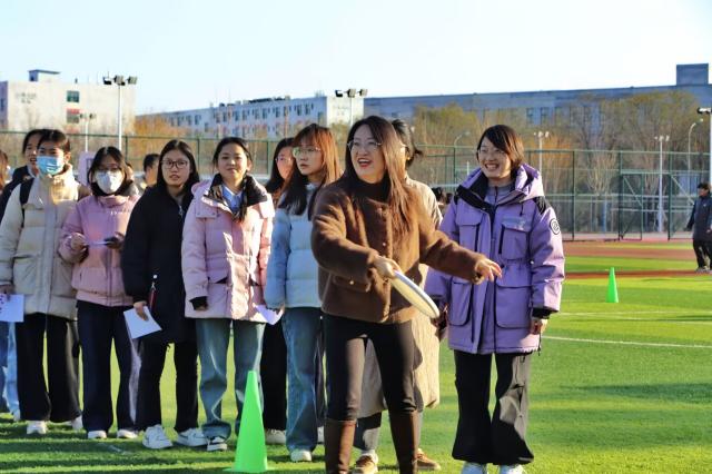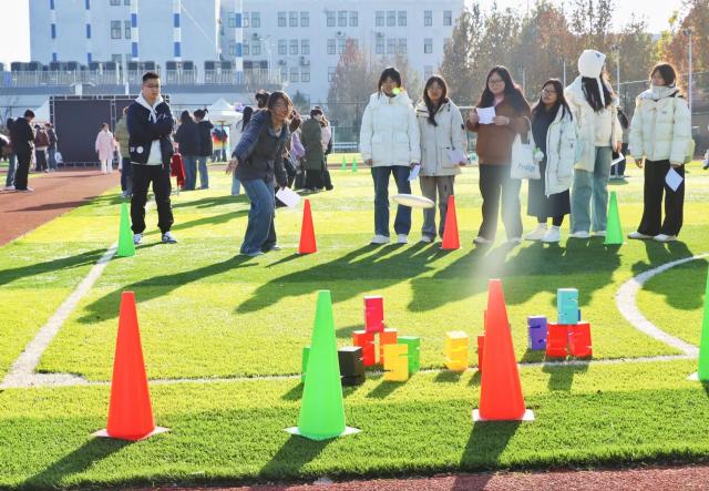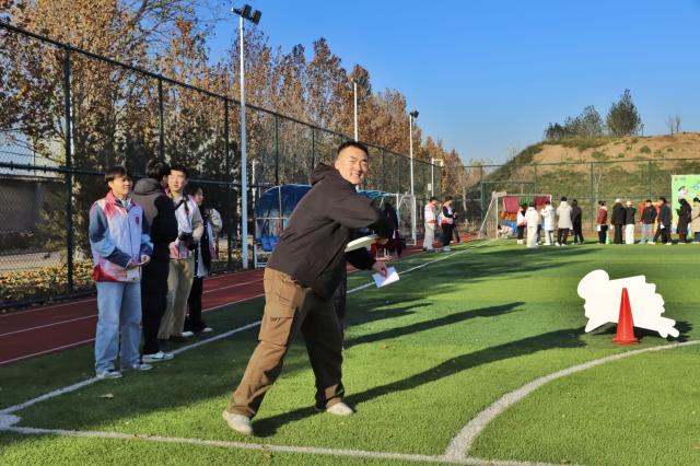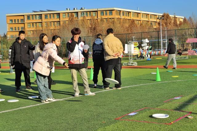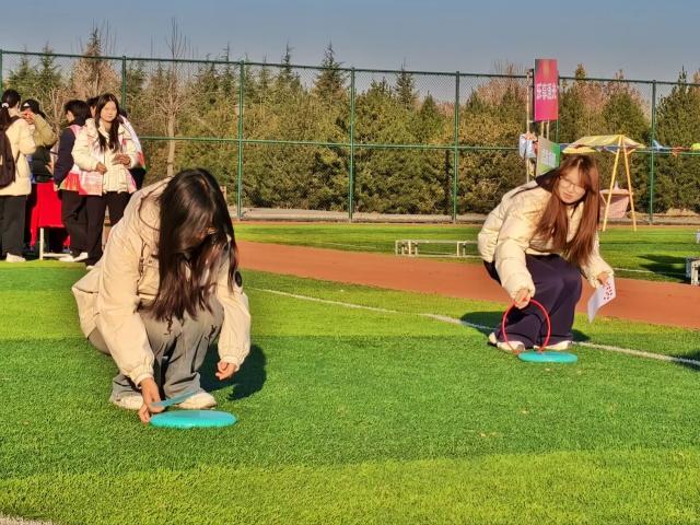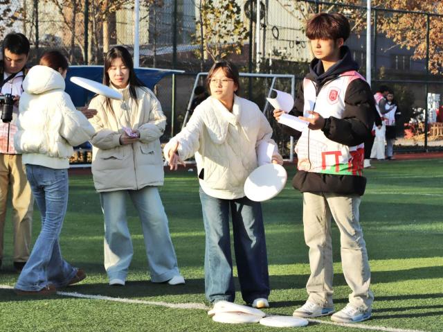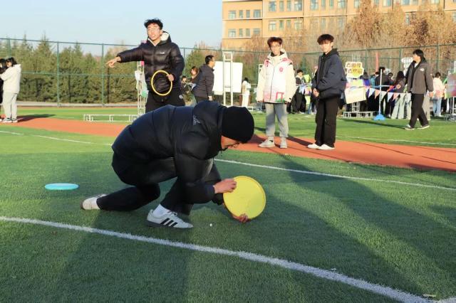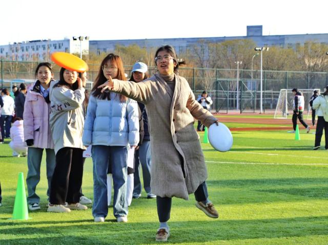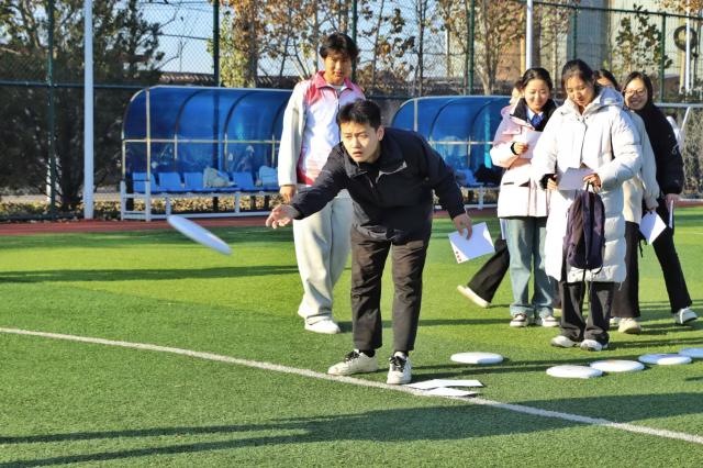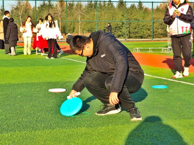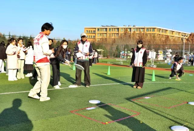 当飞盘破空而出,无论命中与否,总有欢呼与鼓励相伴。失误时,队友的安慰如暖流般治愈;成功时,彼此的拥抱比秋阳更暖。卫娜老师看到同学在九宫格投掷失误时,会主动上前拍拍肩膀鼓励:“没关系,调整一下肯定能中!” 马俊丽老师则在一旁为每一位九宫格选手喝彩,用笑容传递温暖。这朵最特别的小红花,送给赛场上的每一份善意与温暖。