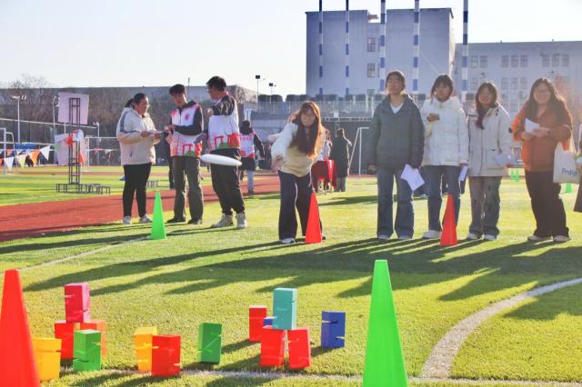 这里没有紧张的竞技氛围,只有飞盘划破空气的轻响。飞盘击倒挑战区,参赛同学站定5米线前,指尖紧攥飞盘,目光如炬锁定方块堆,手腕发力间圆盘呼啸而出,多块方块应声倒地,参加者眼睛一亮,握拳轻呼,雀跃的笑容在阳光下格外耀眼;身旁色彩配对赛的选手快步冲向前方障碍物,蹲身翻找、确认、归位,动作干脆利落,额头渗着细汗却眼神发亮,找到同色配对时,嘴角瞬间扬起释然的笑意,这就是专注时,悄悄绽放的好看花朵呀。