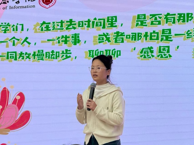 谜语互动结束后,“互动提问分享”环节接力升温。张冰璐老师围绕“成长中最难忘的感恩瞬间”“最想对身边人说的感谢话语”“如何将感恩融入日常生活”等话题发起提问,学子们纷纷举手响应,主动分享自己的故事与感悟。大家真挚的分享引发了现场学子的强烈共鸣,同学们认真倾听,现场掌声不断。通过面对面的交流,大家不仅传递了感恩之情,更汲取了彼此的温暖力量,让感恩的种子在心中深深扎根。