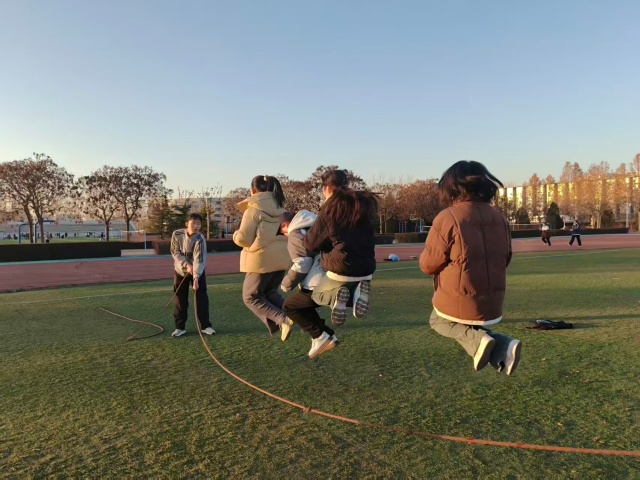 在“集体跳绳”环节中,两名同学积极拿起大绳,为同学们摇绳,其余同学依次排队,每个同学都跃跃欲试,单当大绳真的摇起来时,同学们全部都退缩了,一次次试探,还是克服不了怕被绳子打到的担心。一位同学起跑,起跳,顺利完成第一次跳绳,有了这位同学的打头,同学们都渐渐克服了恐惧。同学们在绳起绳落间灵活穿梭,身影如燕,步伐一致,展现出高度的协调性与集体荣誉感。
