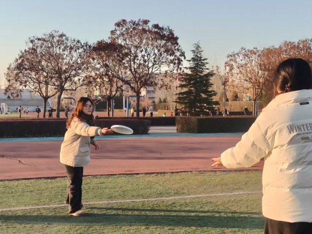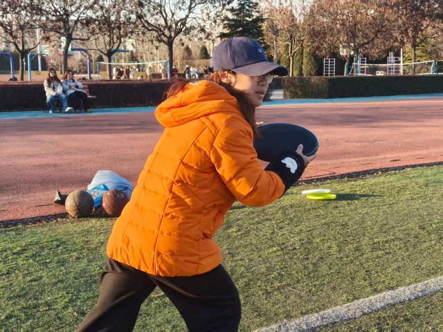 活动的核心环节——“趣味接力赛”将现场气氛推向高潮。第一棒“飞盘接力”要求队员依次传递飞盘,过程中不得落地。但很多同学没有玩过飞盘,当飞盘飞到眼前是,有的同学下意识的躲开,这时,扔飞盘的人就会着急的说“别躲呀,伸手接!”没过多久,同学们已经手眼协调、默契配合,飞盘在空中划出一道道优美的弧线,传递的不仅是器材,更是信任与协作。