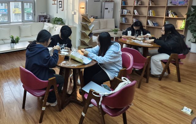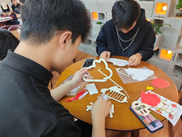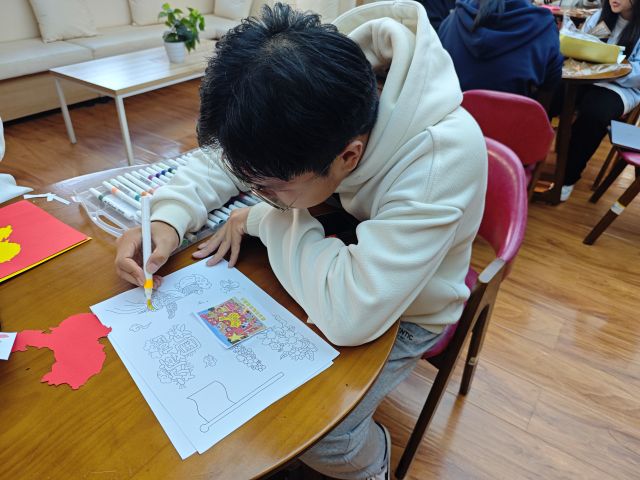 活动伊始,书院活动室里处处洋溢着喜庆氛围。组委提前采购彩纸、竹篾、画笔、丝带等材料,还特意准备了剪刀防护套、胶水分装瓶等工具,确保每位同学安全创作。灯笼制作环节,同学们自发组队、默契配合。一组同学率先拿起竹篾,指尖轻捏慢调,将细篾弯成圆润的灯笼骨架,每一处接口都用细绳仔细缠绕固定,生怕一丝松动影响整体形态。另一组同学伏案裁剪红色彩纸,剪刀起落间,祥云的弧线、五角星的棱角、天安门的轮廓渐渐清晰,随后小心翼翼地将剪好的图案贴在灯笼素面上,让喜庆的元素慢慢铺满灯身。同学们在便签纸上写下“国泰民安”“繁荣昌盛”的字样,裁成精致吊牌,轻轻系在灯笼下方的挂绳上,风一吹便微微晃动,满是灵动的祝福。李同学格外用心,他不仅在灯笼侧面细细绘出万里长城的蜿蜒雄姿,还特意添上了家乡的电视塔地标,“我想把家乡这些年的新变化,和祖国的大好河山画在一起,这样才是我心里最鲜活、最美的中国。”
