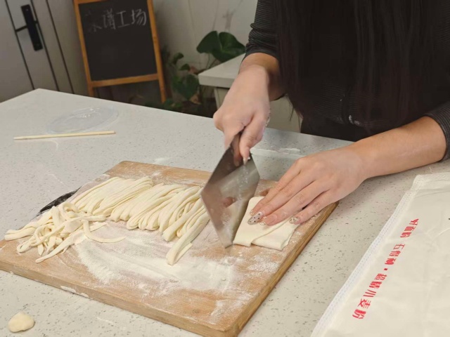跃跃欲试。团支部为大家准备了充足的面团、工具及番茄、炸酱、酸汤等多元浇头,同时贴心提供线上制作教程供参。擅长手工的同学率先尝试传统技法:手握弧形削面刀,在面团上平稳起落,一片片厚薄均匀的面条顺势落入沸水中;指尖翻飞间,不起眼的面团被搓成小巧玲珑的猫耳朵,形态逼真惹人喜爱。对于初次尝试的同学,大家相互请教、耐心指导,从面团软硬的把控到削面力度的调整,从揪片大小的均匀度到莜面栲栳栳的卷制技巧,在一次次尝试与调整中,同学们逐渐掌握要领,脸上洋溢着收获的喜悦。此外,团支部还鼓励大家发挥创意,用食用色素调制出色彩斑斓的面团,DIY 出卡通形象、花鸟图案等趣味作品,让普通的面食制作成为展现想象力与创造力的舞台。当一碗碗热气腾腾的面条出锅,浇上心仪的浇头,同学们围坐在一起品尝自己的劳动成果,麦香与调味交融,欢声笑语萦绕在厨房的每个角落。“这是我第一次亲手做刀削面,虽然形状不够标准,但吃起来格外香!”“通过自己动手,才真正体会到传统面食制作的不易与匠心 ”,同学们边吃边分享着参与感受,在味蕾的满足与实践的乐趣中,进一步拉近了与传统文化的距离。