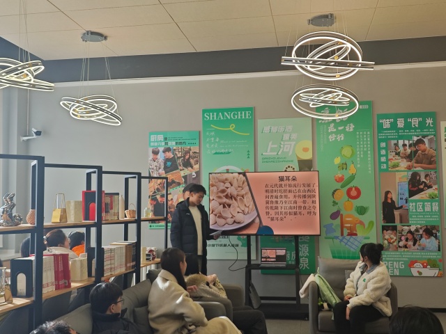 活动伊始,团支部通过精心制作的宣传册与 PPT,为同学们展开了一幅生动的山西面食文化长卷。从被誉为“ 中国十大面条之一 ”的刀削面,别称驸马面,相传为唐朝驸马柴绍发明,弧形刀具削制而成的面条中厚边薄、形似柳叶,外滑内筋的口感背后是代代相传的工艺坚守,到元代便已流行的猫耳朵,因乾隆下江南时品尝后盛赞其形似猫耳而得名,如今已从山西民间走向全国,成为家喻户晓的特色美食;追溯至 4000 年前青海省喇家村遗址的手擀面,历经千年演变,揉面、醒面、擀制、切条的四步工艺凝结着古人的生活智慧,高筋面粉赋予的弹性与浓郁麦香,使其成为家庭餐桌的经典之选;发源于运城、晋中的剔尖,以“两端细长、中间宽厚 ”的独特形态和香滑筋道的口感,流行于晋蒙陕冀等地,白面、高粱面、杂粮面皆可制作的包容性,彰显着民间饮食的智慧;而莜面栲栳栳作为山西十大面食之一,以沸水和面、掌推指卷的精湛工艺,制成形似竹编“栲栳 ”的蜂窝状成品,不仅入选《中国面食技艺保护名录》,更承载着“牢靠和睦 ”的民俗寓意,成为寿诞、婚嫁等礼仪场合的特色美食,搭配羊肉臊子汤或凉汤食用,素有“一家吃着十家香 ”的美誉。详实的讲解让同学们对山西面食的文化内涵有了更为深刻的理解,现场不时响起阵阵赞叹。