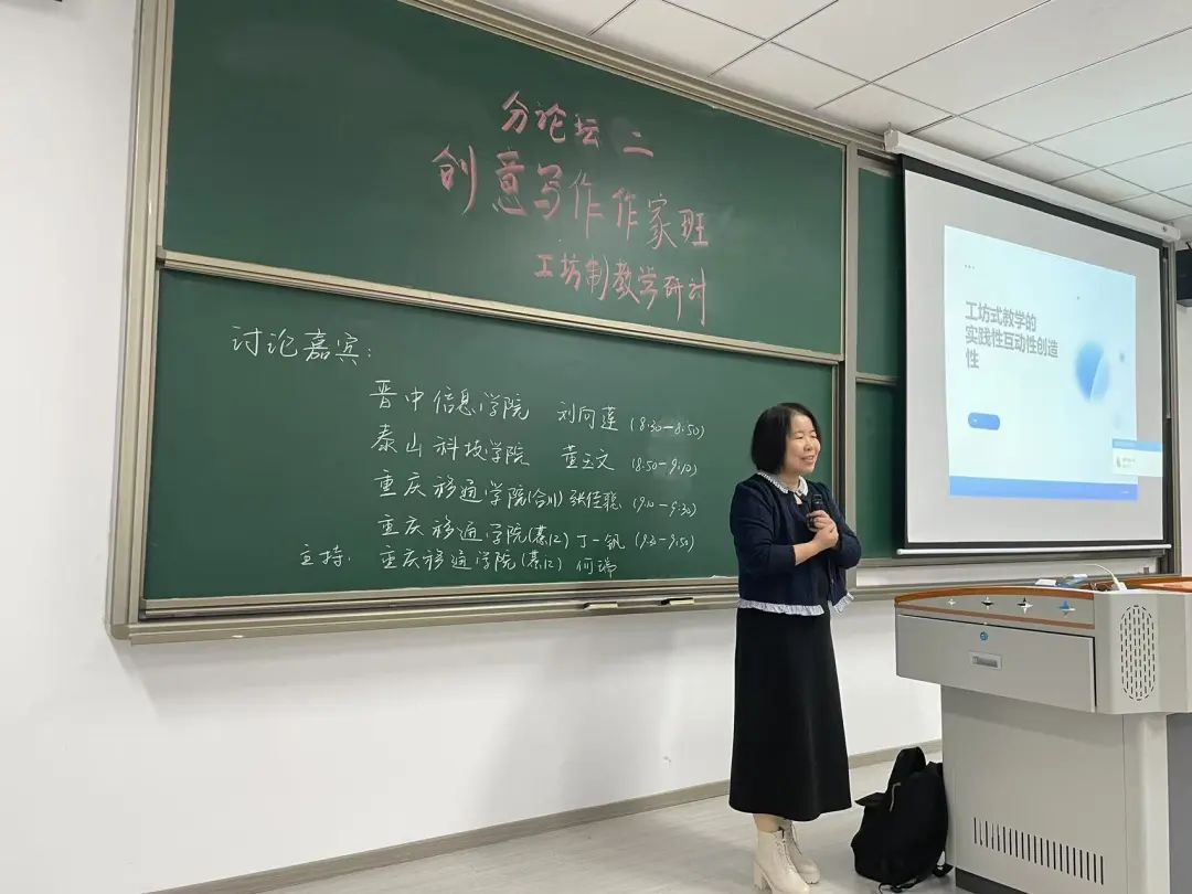 在第三组“《创意写作》课程教学研讨”上,针对讨论的主题,王绍燕老师分享的主题是“学生为本,立足课堂,激发创意——《创意写作》课堂教学方法探析”,分享的内容包括明确教学理念、调整教学内容、更新教学手段、完善课程评估四个方面,结合课堂实际情况,明确以学生为本的教学理念,针对具体的学情、要合理调整教学内容,提升学生抬头率;教学手段上避免让学生海绵式吸入,采用淘金式的思维互动,启发式的教学方法提升课堂教学质量,同时要做好课程的评估体系,为课堂教学提供理论支撑,不断改进课堂手段,提升课堂教学效果。