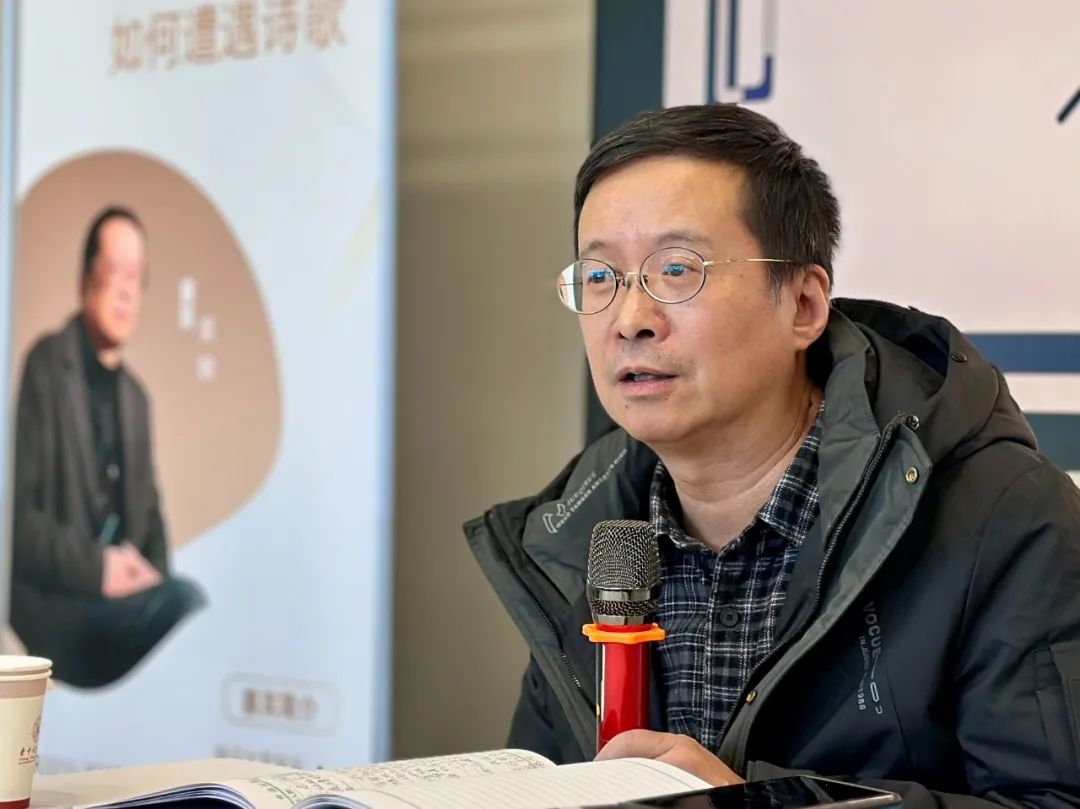 随后,吴炯老师转向诗歌与小说创作的主题,提出了“如何遭遇诗歌”的问题。他强调,诗歌的魅力在于其“相遇性”——诗歌并非仅仅通过“懂”来解读,而是通过情感和心灵的触动来与读者产生共鸣。他建议,诗歌的欣赏应关注其精神层面的升华,而不仅仅是语言修辞的优美。他还分享了两首来自俄罗斯和法国的诗歌,通过朗读让同学们直观地感受诗歌的深度与魅力。