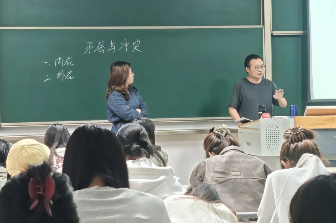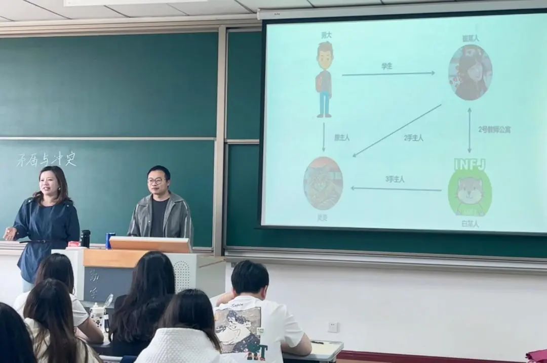 课程伊始,白海飞老师以一段诙谐的“相识往事”点燃课堂。原来,两位老师的合作契机源自一场学生宿舍的“宠物风波”——某学生因偷偷养猫与宿舍管理规定产生冲突,崔老师以“如何将矛盾转化为故事”为切入点参与讨论。这场真实的“猫的博弈”迅速引发学生共鸣,白老师调侃道:“这只猫不仅是矛盾的导火索,更是我们跨学科合作的‘吉祥物’。”通过分析“情感需求”与“规则约束”的对抗,学生直观感受到“矛盾潜伏于生活细节,冲突爆发于行动抉择”的创作真谛。