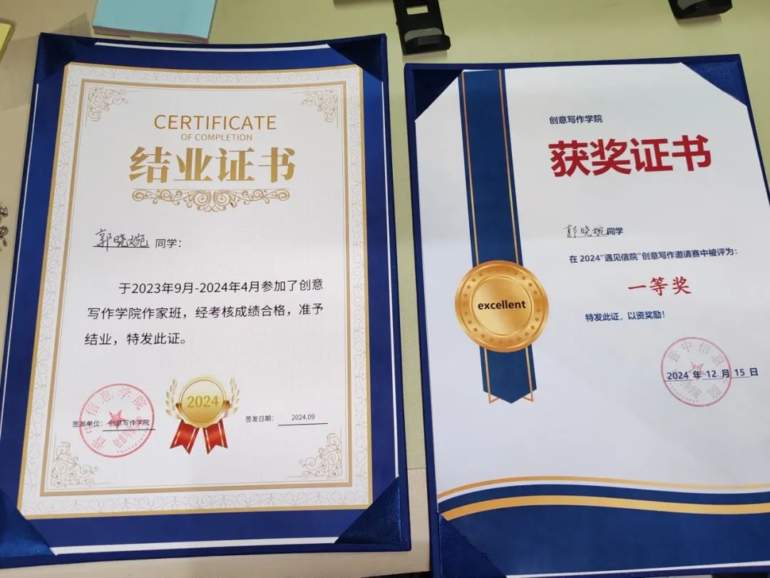 参加了颁奖典礼后,我心里充满了成就感和满足感。我非常庆幸自己来到这个学校,加入了创意写作学院,有手把手教我写作的作家老师,我想,即使我考入了重点大学的中文系,也不一定有这样的机遇吧。
