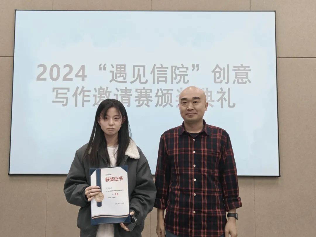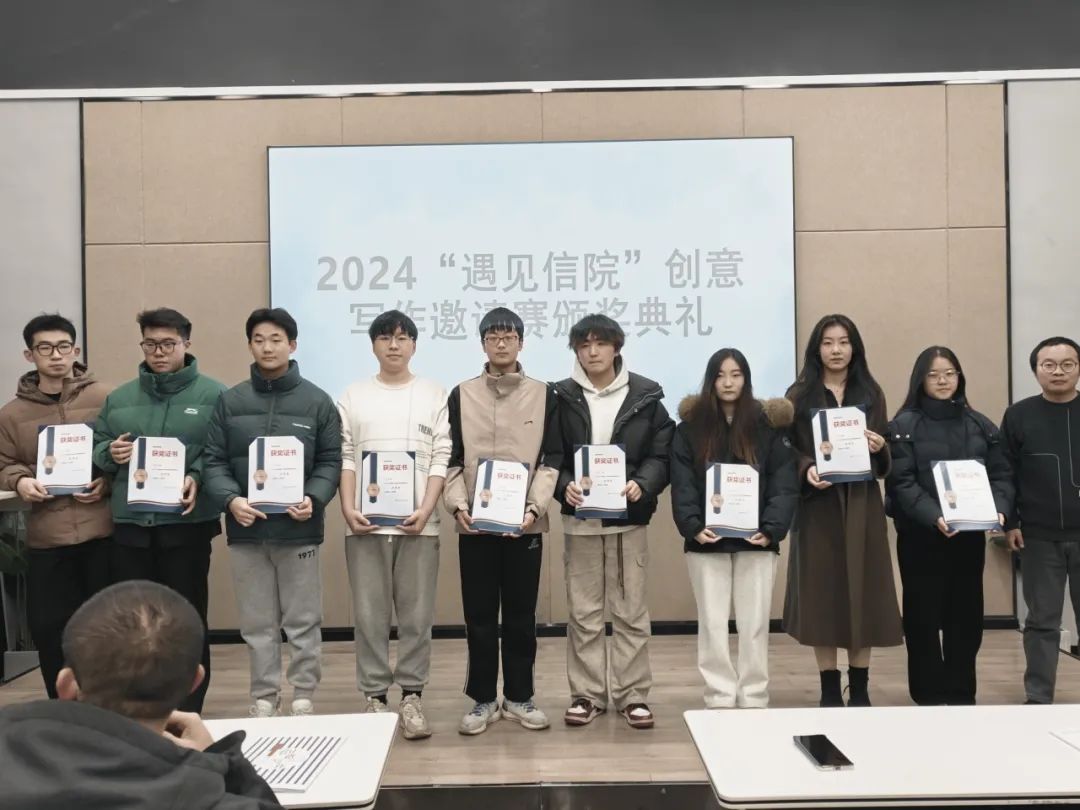 12月15日晚,2024“遇见信院”创意写作邀请赛颁奖典礼在上河书院隆重举行,来自创意写作学院作家班导师们、获奖作者、作家班成员齐聚一堂,共同见证这一文学盛事。本次活动旨在表彰优秀的创意写作作品,激发学生的创作热情,同时通过主题讨论和师生互动,促进写作经验的分享与交流。