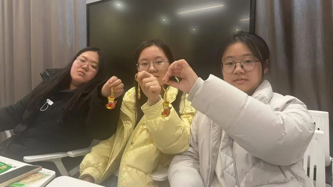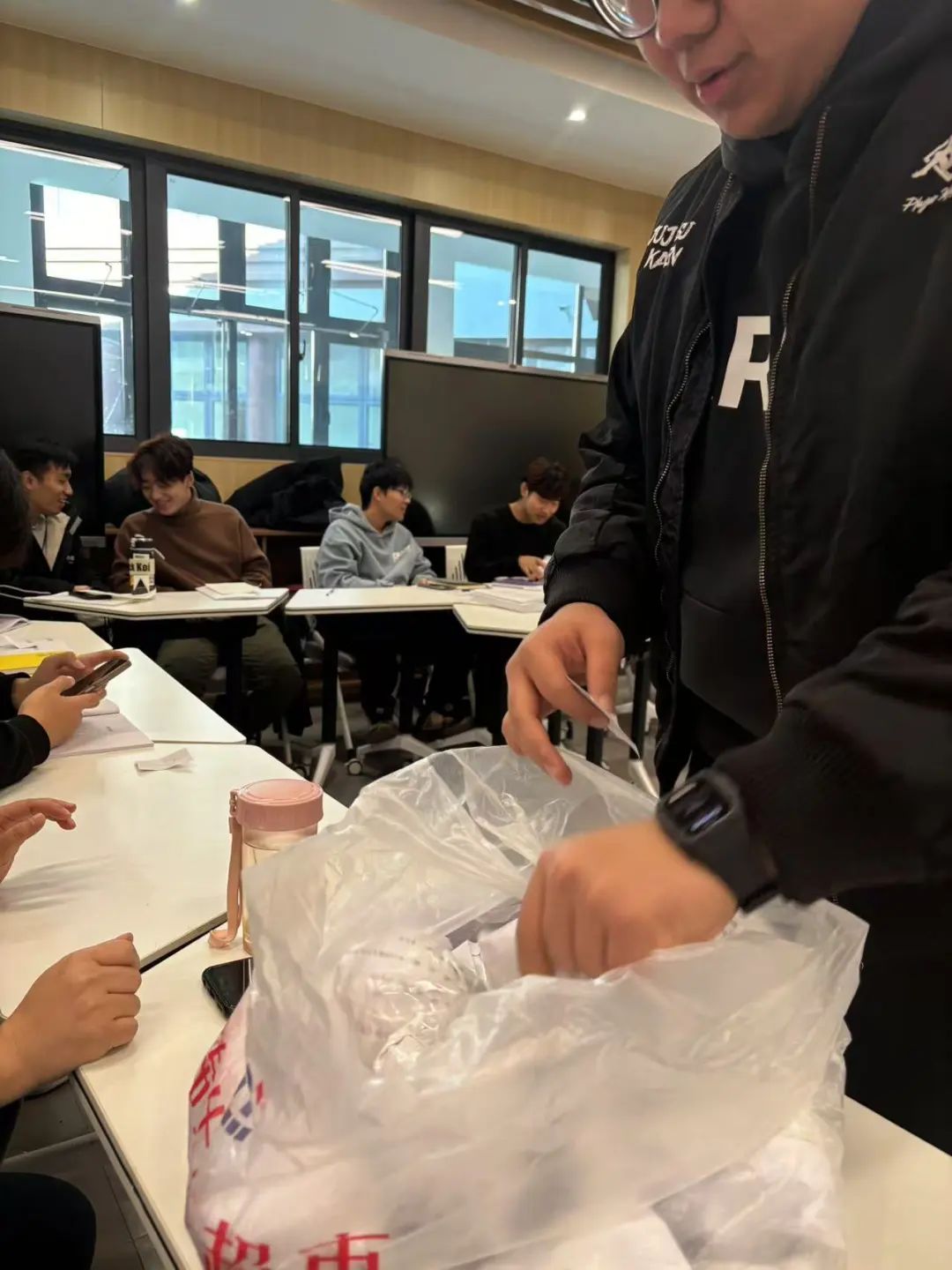 学生们通过抽签的方式确定抓取盲盒的先后顺序。近三十个盲盒全由办公废纸包装,里面分别是苹果、鸭梨、橘子、山楂、菠萝蜜、辣条、薯条等,水果、干果、点心和零食等。在拆盲盒的环节,不时传来学生们的尖叫声、欢呼声以及窃窃私语,大家对于自己抓到的东西都感到很意外。