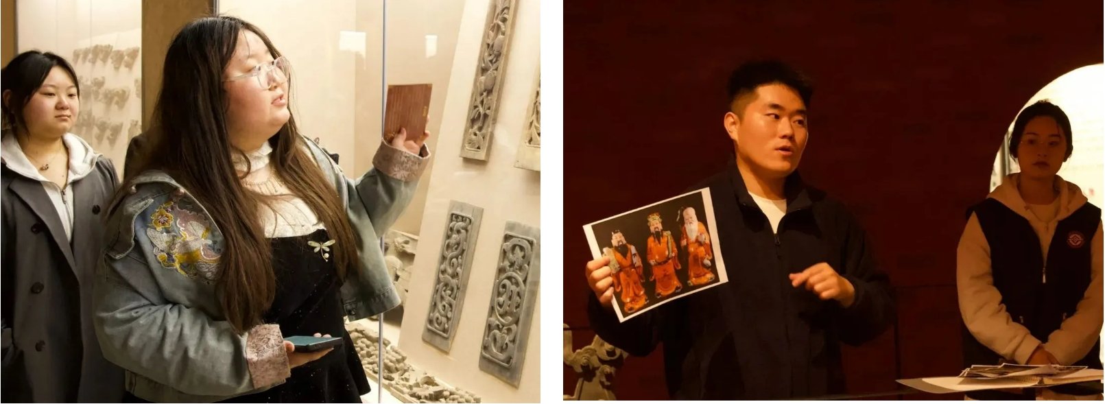 活动伊始,各位参与者在学生非遗研究员的带领下,对馆区进行了整体参观,了解了展品基本情况,随后参与者们分别佩戴不同颜色手环,以小组形式进行“非遗探秘”。同学们在砖雕门楼的华美纹样间捕捉“福寿双全”的美好寄寓,于木雕对联的笔走龙蛇间品读“忠厚家风”的晋商密码。寻宝过程中,大家围拢在展品周围,详细记录研究,他们的镜头掠过鸱吻吞脊的威严,定格在窗棂冰裂纹的玲珑,指尖抚过门当石鼓的沧桑,在方寸之间丈量着传统文化的温度与厚度。寻宝时间结束,各小组分别对“寻宝”结果进行了分享讨论,对展品砖雕门楼当中的人物纹样所代表的文化内涵进行了深入挖掘和研究。