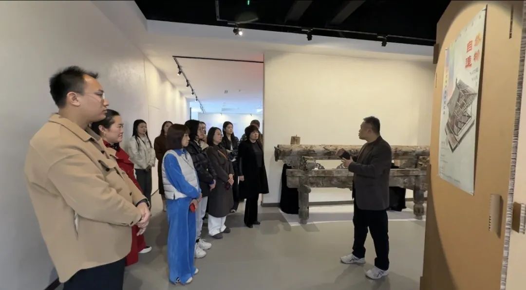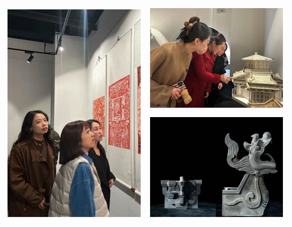 活动伊始,艺术传媒学院院长盛卓立老师带领视觉传达设计教研室团队参观了非物质文化遗产馆,从视觉传达设计的专业角度出发,融合AI技术,深度挖掘了展品内涵,数字化呈现展品视觉符号与美学理念,这些元素能为视觉传达设计教学提供独特的素材与灵感来源。通过将非遗文化与视觉传达设计课程相结合,不仅能够丰富教学内容,更能培养学生的文化传承意识与创新设计能力,使学生在掌握专业技能的同时,深刻理解并传承中华优秀传统文化。