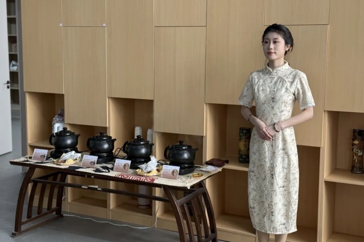 非遗研学空间内,柳惠武现场演示除湿汤剂炮制工艺,通过太谷黄芪米泔水浸泡、紫铜药吊文火熬煮等步骤制成琥珀色药汤。师生品鉴后感叹"初苦回甘,药效循经",直观感受中医药理精髓。