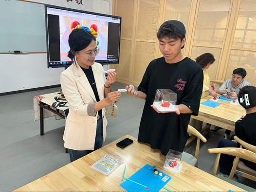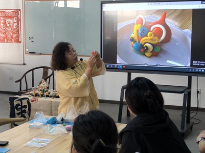 实践环节,是非遗美育的关键所在。同学们在赵翠莲老师的悉心指导下,全身心投入到“吉祥虎”面塑的制作之中。“制作老虎要先把握神态,再塑造形体”,赵老师娴熟地演示着从整体塑形到细节雕刻的全过程,学生们则兴致勃勃地动手实践,在老师的悉心指导下,逐渐掌握了揉、捏、刻等基本技法,将非遗技艺之美融入自己的创作之中。而赵晨倩老师则适时引导学生运用“knead(揉)、pinch(捏)、roll(搓)”等英语动词描述制作过程,实现了技艺学习与语言运用的有机结合。这种“技艺实践 + 语言输出”的创新教学模式,不仅让学生在动手实践中深刻体会到非遗创作的美学价值,更通过英语表达,将非遗之美传递给世界,让非遗美育在实践与交流中焕发出新的活力。