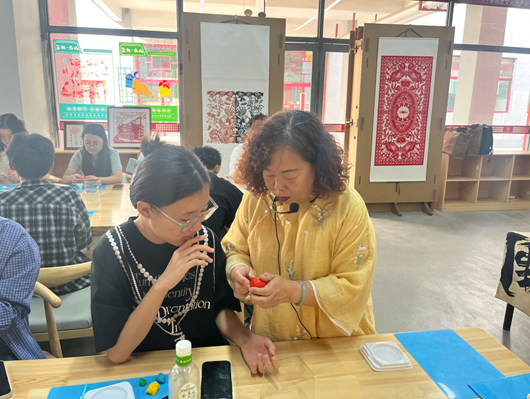 在实践课堂上,非遗美育的画卷徐徐展开。面塑非遗传承人赵翠莲老师,以其匠心独运的技艺,为学生们揭开了传统面塑的神秘面纱。“面团的配比是作品成功的关键”,赵老师一边讲解小麦粉、糯米粉与淀粉的黄金配比,一边示范刻刀雕刻的技巧要领,这些凝聚着农耕文明智慧的传统工艺,如同璀璨的明珠,令在场学生赞叹不已。赵老师的一招一式,都传递着非遗技艺的美学精髓,让学生们深刻体会到非遗技艺的精妙之处,感受到非遗美育的实践魅力。