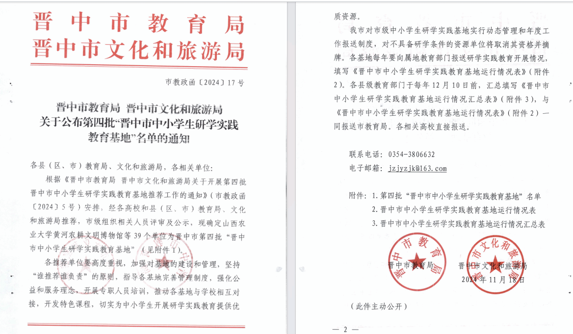 2024年11月,晋中信息学院非物质文化遗产研究中心(以下简称“非遗研究中心”)迎来重要发展里程碑——在晋中市教育局、晋中市文化和旅游局联合公布的第四批“晋中市中小学生研学实践教育基地”名单中成功入选,为学校非遗文化传承与教育实践工作再添重磅荣誉。这份荣誉激励着我们继续前行,秉持着传承文化、教育创新的理念,不断探索和实践,为守护中华民族的文化瑰宝,推动非物质文化遗产的传承与发展贡献我们的全部力量,让非遗文化在新时代绽放出更加绚烂的光彩。