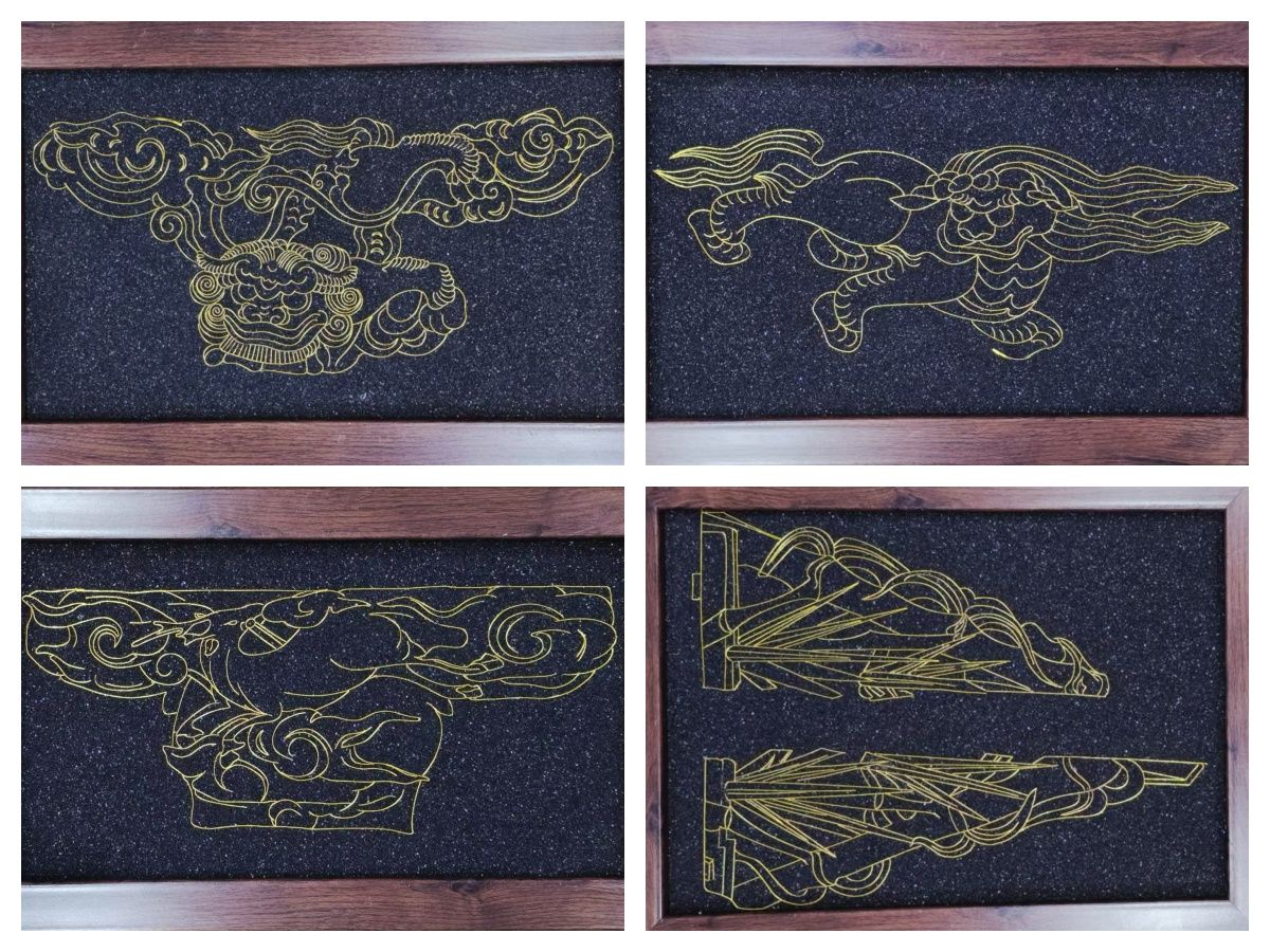 这组花丝珐琅作品的灵感,源自乌马河非物质文化遗产馆内展品的传统纹样。创作团队选取祥云、瑞兽、游龙等经典图案,以深邃黑色作为基底,搭配金丝掐丝技艺勾勒造型。黑与金的碰撞形成鲜明对比,让作品既保留传统韵味,又兼具视觉张力。通过对花丝珐琅这一非遗技艺的传承与创新,古老纹样被赋予新时代表达,跨越时空焕发新生。这也直观展现了晋中信息学院在非遗美育与专业教育融合方面的实践成果,为传统文化创新应用提供了鲜活案例。