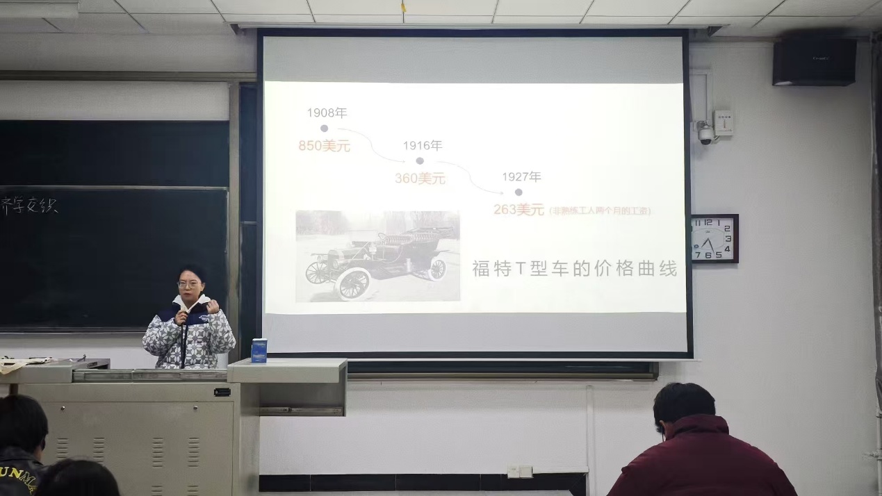 课堂伊始,杨老师介绍了福特汽车公司初创时以T型车开拓市场,秉持“功能决定设计”的理念,因性价比高而广受欢迎。1913年,福特引入流水线生产,提高了效率,降低了成本,使汽车普及。这一模式促成了福特主义,即以市场为导向、分工专业化、低价竞争的生产方式,极大地提高了劳动生产率,扩大了福特汽车的市场份额。