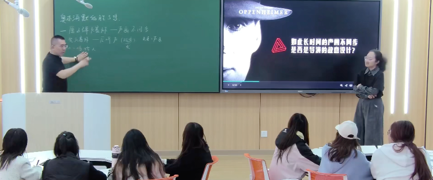 当讲台上的大屏幕播放着原子弹试爆的场景,所有同学屏息凝神,期待那一声巨响······一场别开生面的双师课堂正在展开。近日,在《时间简史》的课堂上,赵云老师与电影学专业的周立萌老师联合为同学们延伸出一条指向“奥本海默”的思维导图,揭示这位原子弹之父如何同时成为现代科学的光辉象征与道德困境的永恒缩影。黑板中央写着“比一千个太阳还亮”,这正是奥本海默在目睹人类首次核试验时引用的古诗。