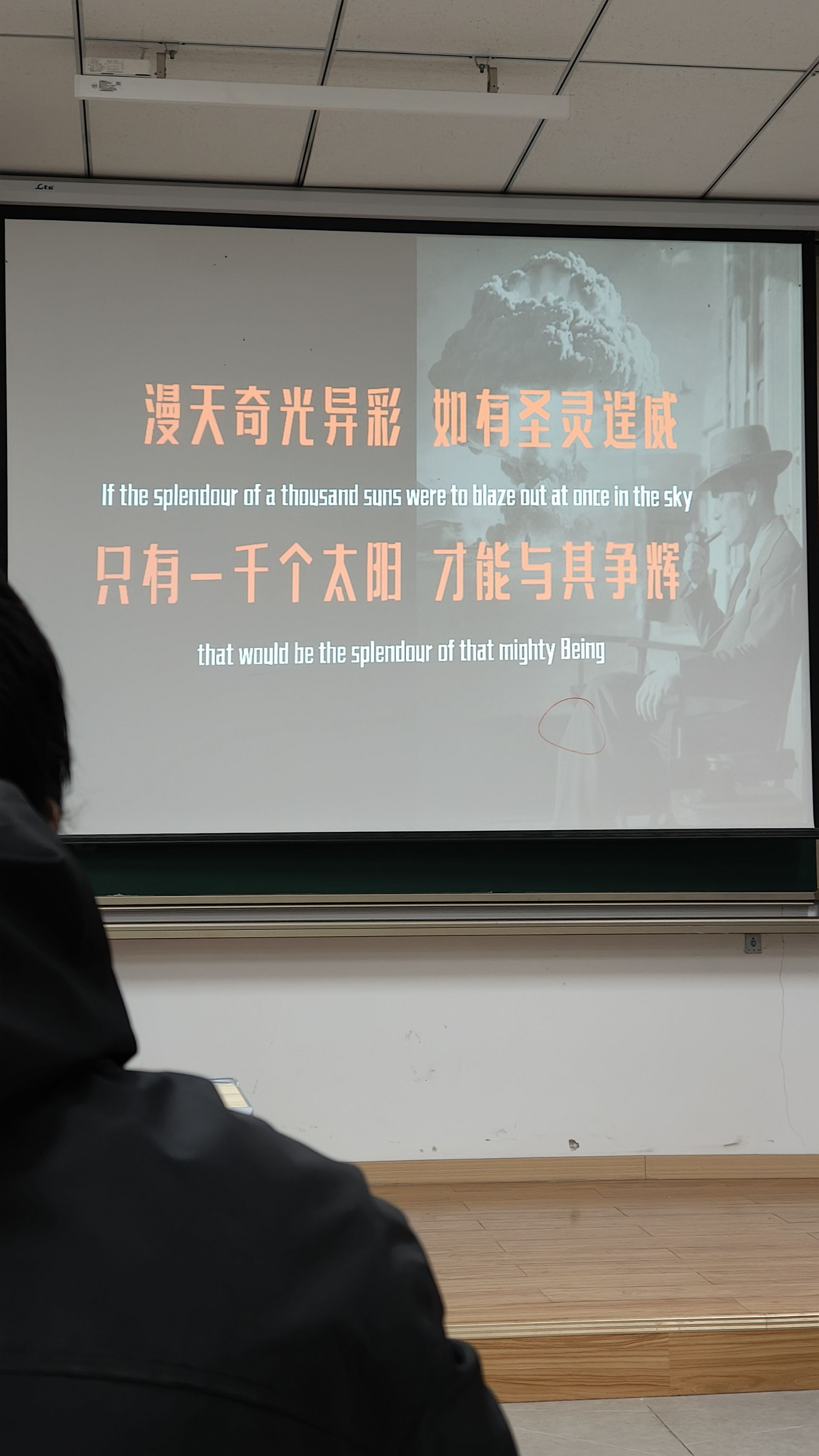 当视频画面最终定格在奥本海默那句著名反思“物理学家们已经尝到罪的滋味,这是他们无法忘记的”时,同学们也不禁陷入沉思:在追求科学真理的道路上,人类该如何承担随之而来的责任与后果?