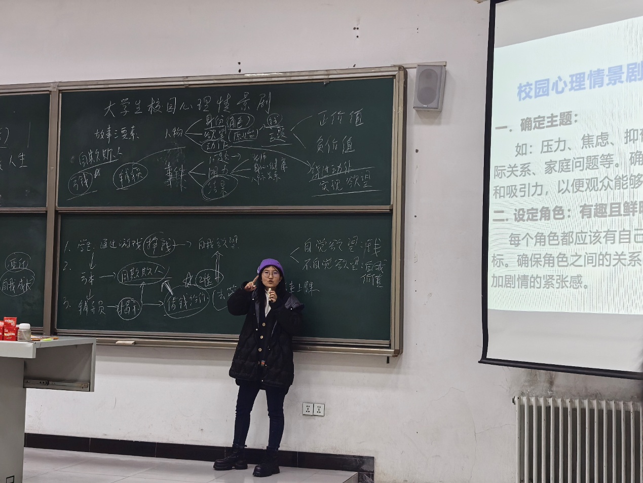 课堂伊始,两位老师围绕“校园心理情景剧”这一概念分别从不同学科视角展开讲解。贾老师从心理学角度出发,阐述了心理剧是如何通过角色扮演帮助学生处理心理冲突、表达不良情绪、缓解自身压力的。仲老师则从戏剧创作的角度,讲解了情景剧的戏剧特征与表现手法,帮助学生理解心理情景剧作为一种融合艺术形式的独特魅力。