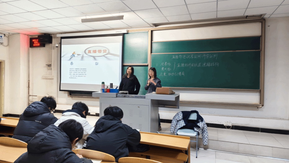 近日,在《生活中的经济学》课堂上,杨晋丽老师邀请有着传播学背景的任晋茹老师联袂开展双师课堂,共同解读直播经济现象。本次课堂采用“回合制深度对话”形式,将经济学的理性分析与传播学的意义阐释有机融合,带领学生穿透“直播间秒光”“主播带货破亿”等现象表层,深入理解直播经济背后的双重逻辑。