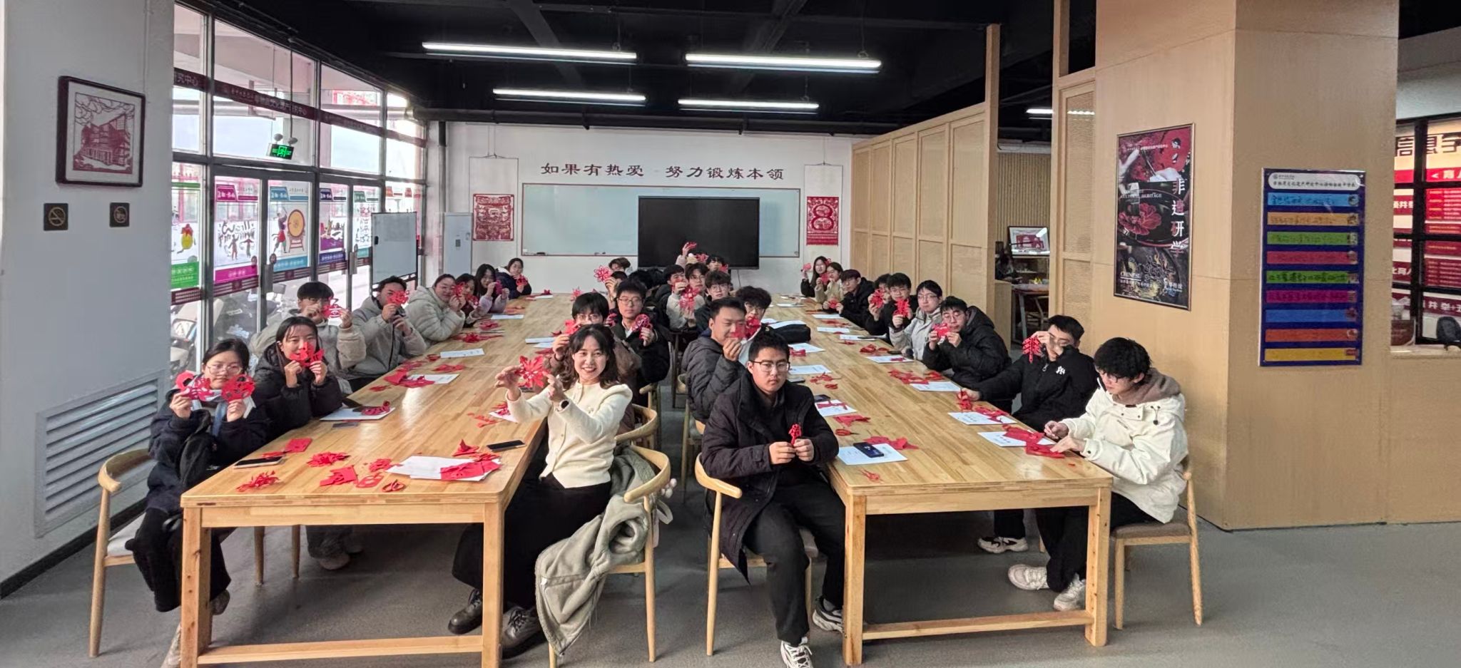 参观环节意犹未尽,实操体验更是让现场气氛推向高潮。在剪纸体验区,赵云老师先为大家讲解了山西剪纸的历史渊源和基本技法,从折纸的角度到剪刀的力度,都耐心细致地进行示范。“原来一张普通的彩纸,能剪出这么多花样!”同学们跃跃欲试,纷纷拿起剪刀和彩纸,跟着老师的步骤一步步操作。