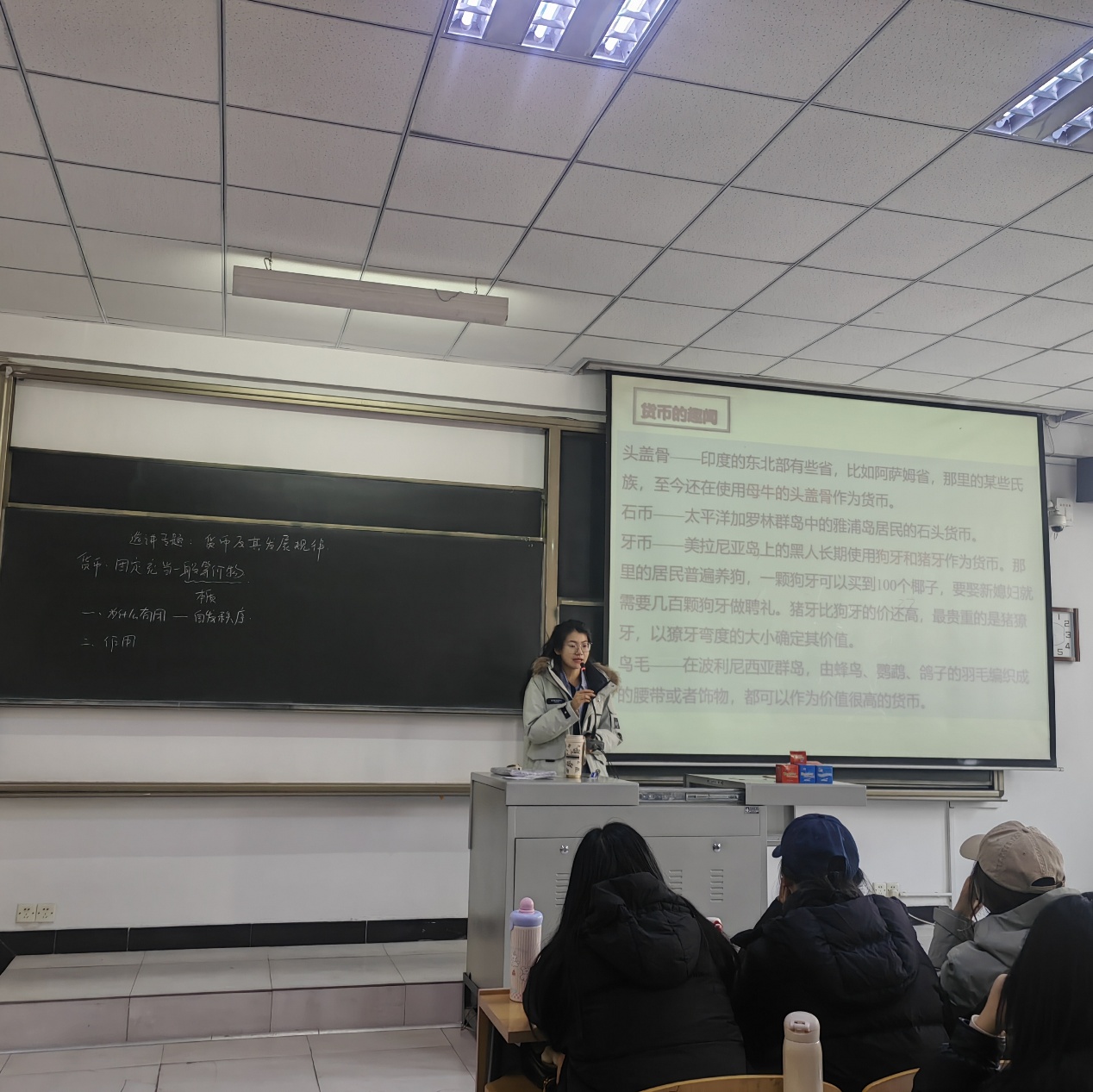 在“货币趣闻”环节,戴国庆老师分享的三组冷门史料引发课堂热潮:1、印度阿萨姆邦的母牛头盖骨货币:反映原始部落对牲畜的价值崇拜;2、雅浦岛的石币体系:重达数吨的石头通过所有权共识完成交易,印证-货币本质是信用符号”的经济学原理;3、波利尼西业的鸟羽货币,稀有羽毛编织的腰带可等价交换土地,揭示“价值主观性”的经济哲学。配合播放的《雅浦岛石币》纪录片片段,学生深刻理解“货币的价值源于社会共识而非物质本身”,这一认知为后续埋下伏笔。