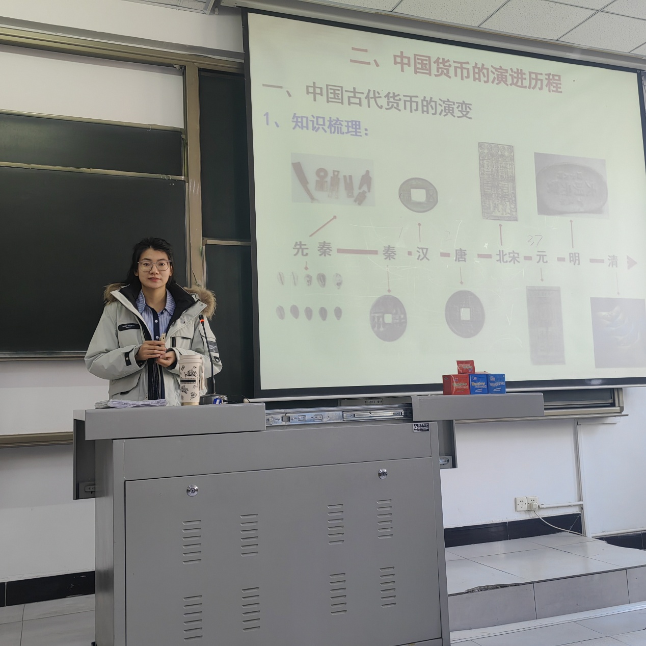 经济学杨泽赟老师以马克思“货币是商品交换的神秘面纱”为引子,抛出核心问题:“货币如何从“2只羊=1把斧头”的原始交易,演变为今天的数字支付?”历史学戴国庆老师随即接手“时空接力棒”,通过四组关键史料还原货币进化史:1、偶然的物物交换:用“2只羊=1把斧头”的案例,揭示私有制萌芽时期“需求错位”的交易局限;2、扩大的物物交换:模拟“红珍珠换咖啡”情境,学生亲身体验“想喝咖啡却只能先换牛奶”的双重偶然性困境;3、一般等价物诞生:以“羊作为交换媒介”为例,经济教师解析“体积小、价值大、易分割”的核心特征;4、货币固定化阶段:展示先秦铜贝、秦半两、汉五铢实物图片,论证“货币从商品中分离的经济必然性”。