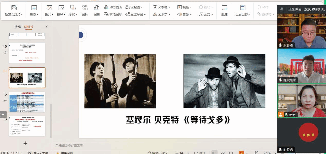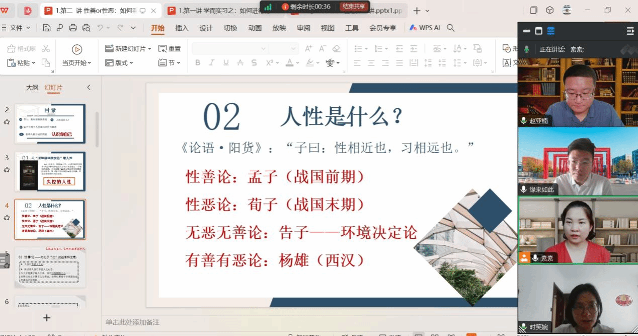 其次赵亚楠老师对“中国哲学智慧”课程的前两讲进行说课,赵亚楠老师介绍了在导论部分引导学生要理解“人类命运共同体”对世界文明的重要意义,突出中国哲学智慧的重要意义;在第一讲“学而实习之:如何有效学习”一节中以董宇辉等几个带货主播为案例,说明学习的重要性,以荀子《劝学篇》为例,说明中国古代所确立的学习观、学习态度及学习方法。时笑婉老师认为可以选择当下发生的案例,注意案例的时效性。