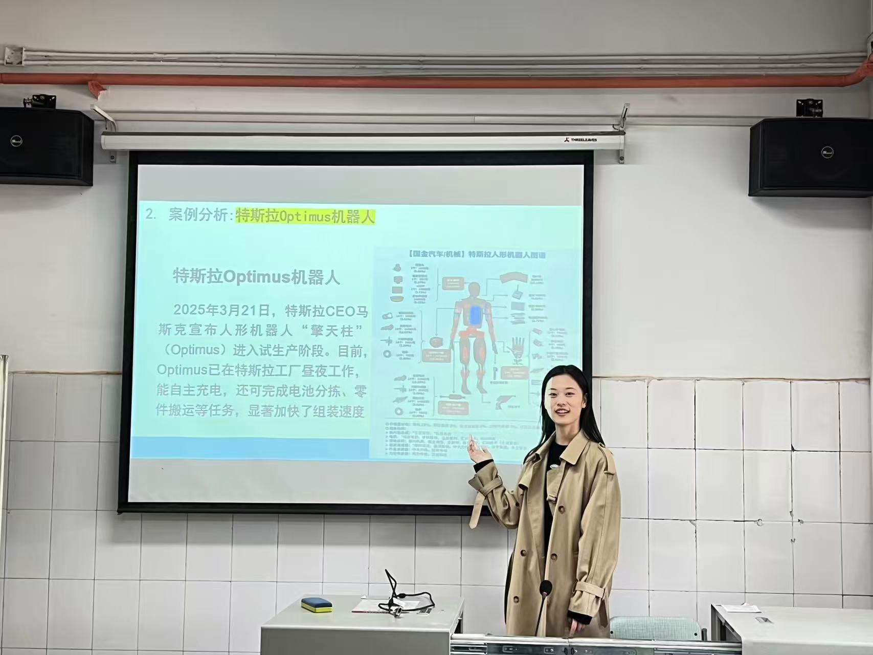 王彤老师在试讲时围绕“AI如何落地制造业并改变生产模式”主题开展,以特斯拉Optimus机器人、AITO问界M5无人化制造、iPhone智能生产三个案例为核心线索。在讲解每个案例时,补充具体数据——如Optimus使产品合格率从90%提升至99.9%,问界M5用AI质检将检测时间缩短75%,并对比传统制造与AI制造的差异。通过案例细节,让学生直观理解AI在效率提升、质量控制、分工调整上的作用,明确“技术如何转化为实际生产力”。