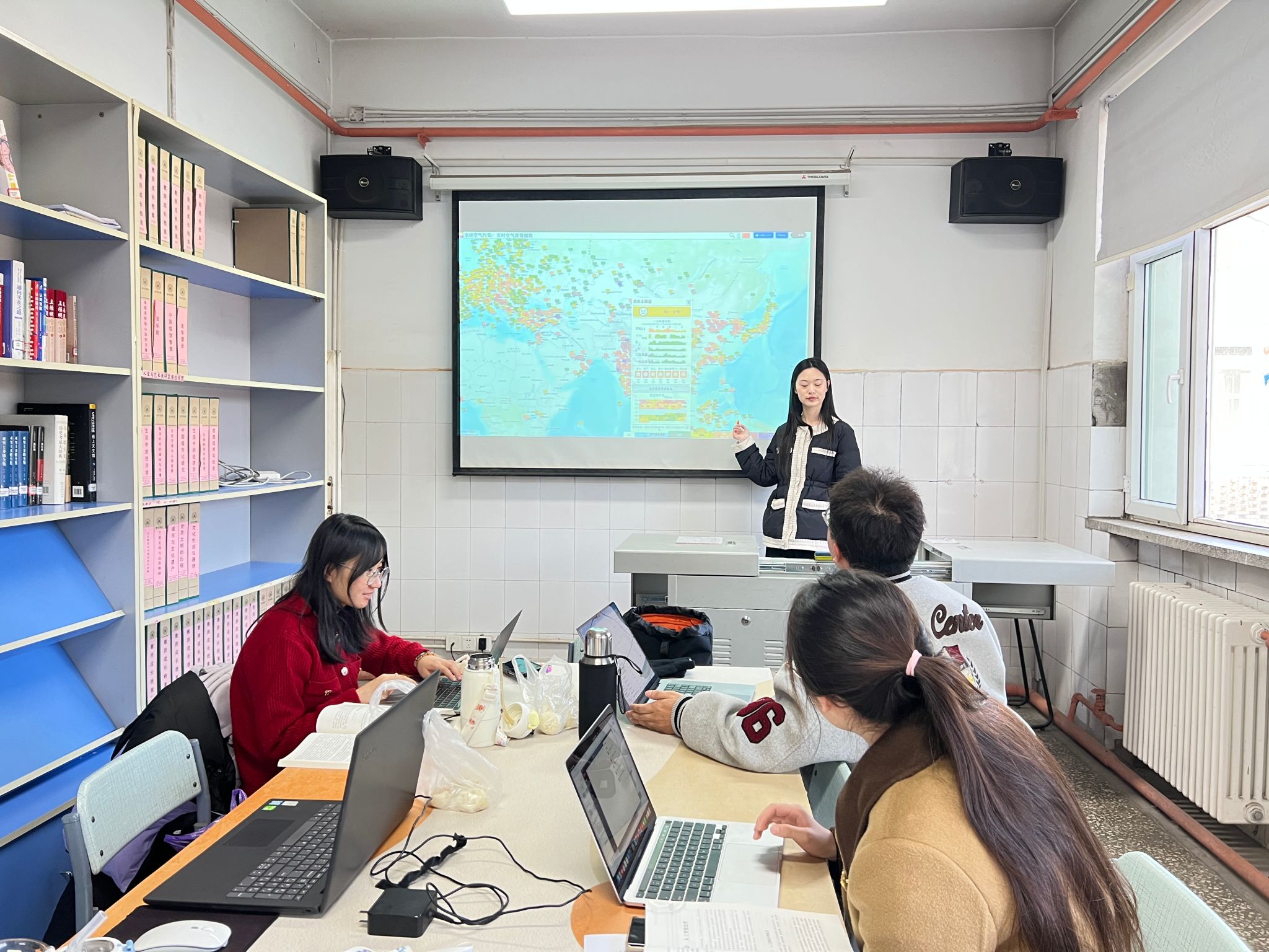 第九讲试讲由李雪萌、王彤老师授课。试讲前,两位老师深入研读讲稿,结合课程目标,精心设计教学环节,明确重点难点。李雪萌老师聚焦“AI在环境监测与灾害预警中的应用”,以ADIS海洋塑料监测系统、森林火灾“空天地”监测网络为例,讲解AI精准监测逻辑,引入加州山火预警、洪水街道级预测案例拆解技术原理,并预设互动问题引导学生思考。