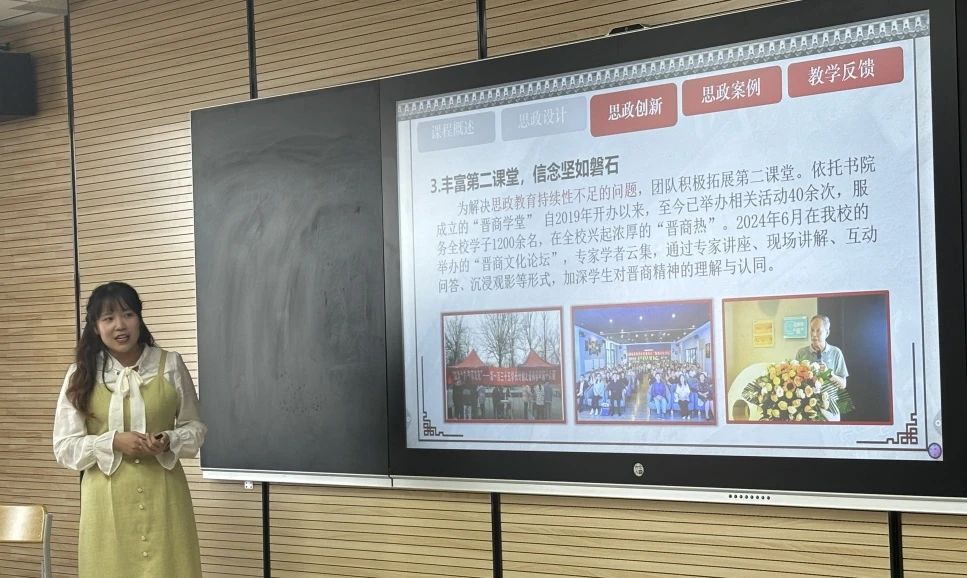 接下来是李珂老师的课程《山西票号与近现代金融》的思政创新设计,李老师紧密围绕立德树人这一思政目标开展,立足于实际,培养新商科人才,与学校理念紧密相连。立德树人是课程思政的出发点,“课上+课下”的双主线是课程思政的着力点,课堂、书院、实践则是课程思政的“三阵地”,将弘扬晋商精神作为课程思政的“落脚点”。课程以“1+1+1”模式,古今互融,利用经典案例、第二课堂、线下研学等方式吸引学生兴趣,师生共成长。