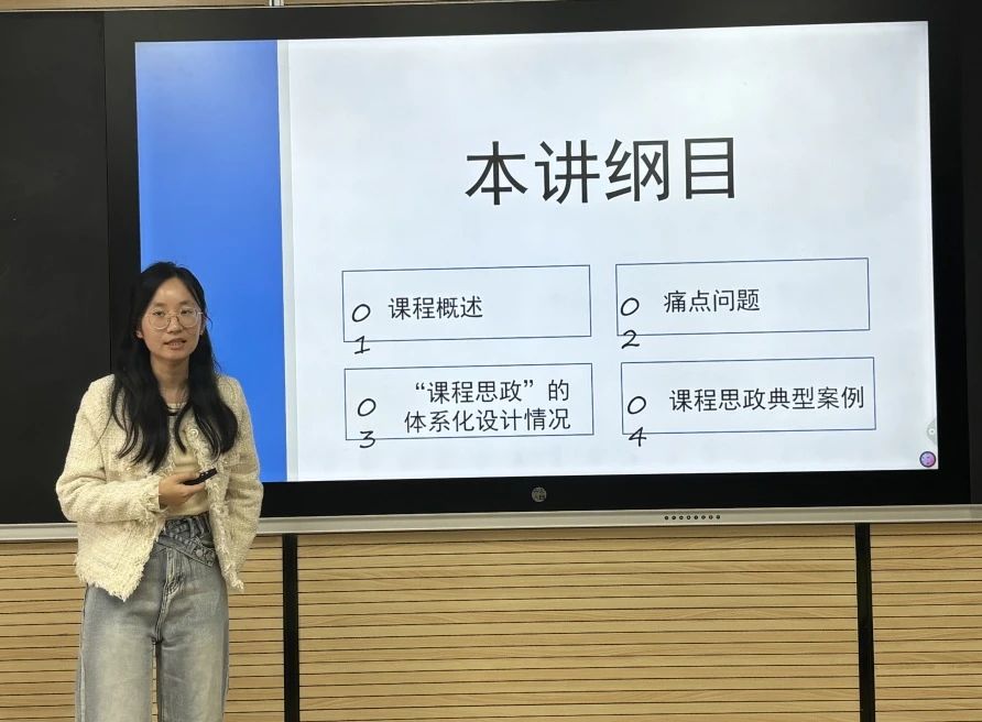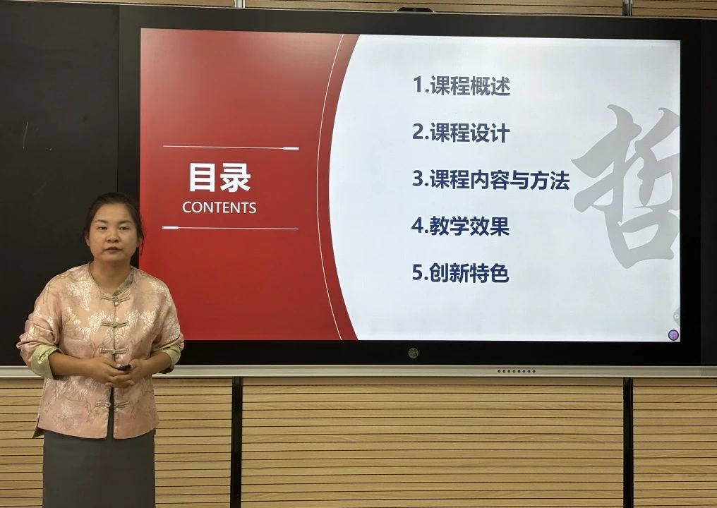 第三位是张素英老师的课程《中国哲学智慧》,张素英老师首先介绍了课程的基本信息,这门课程的主要目的是为了让学生拥有中国文化自信和独立思考的能力以至成为当代君子。其次指出了这门课的教学的三个痛点:不想学、学不会、不会用,这三个痛点也就是课程的教学目标。张老师将课程思政创新放在了课程的教学内容上,从个人品质到公民责任再到人际关系,由点及面,逐步引导学生产生对哲学的兴趣。同时,课下会举行有关课程的辩论赛和读书会等活动。张素英老师讲,从以上方面的种种引导,学生从被动学变为主动做,学生在课下会拍摄相关视频进行学习分享,也会引导学生参加各种比赛在实践中巩固,在实践中进步,师生一起共成长。