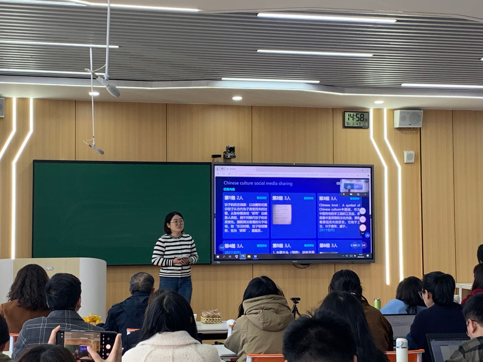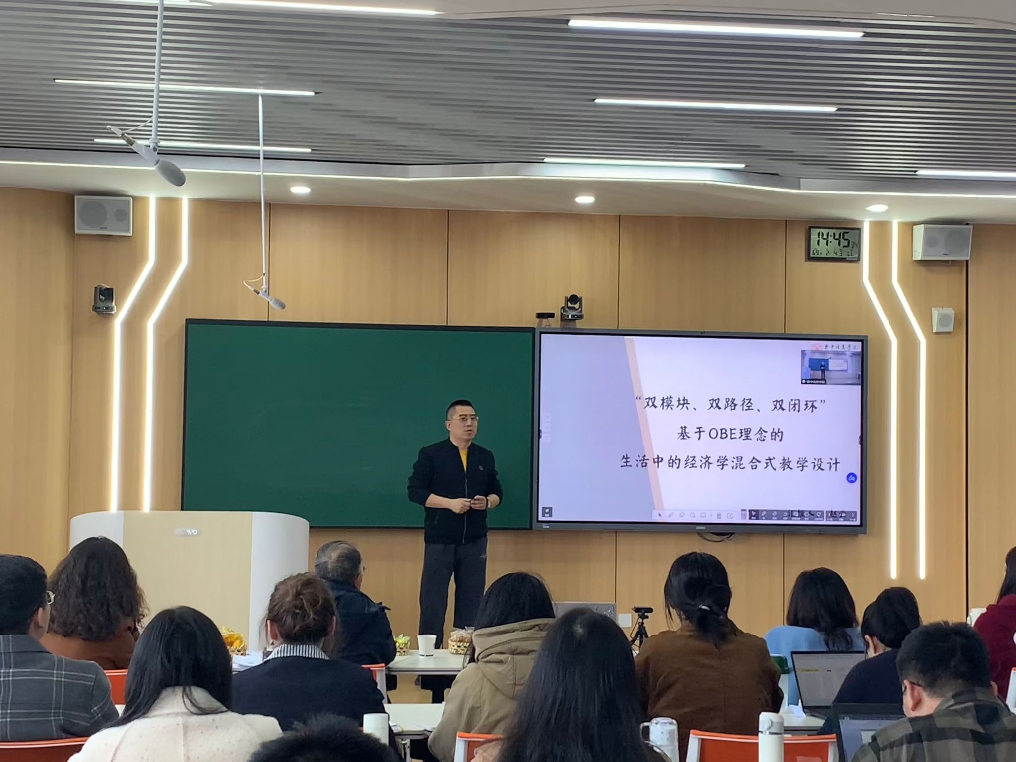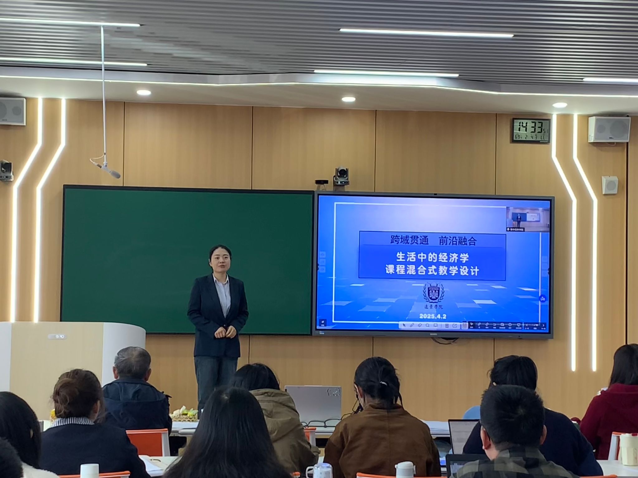 程荣荣老师分享了“跨域贯通 前沿融合”《生活中的经济学》课程混合式教学设计,线上线下有机融合,构建了完备的线上教学资源库,利用智慧教室、书院平台、实践基地三维空间进行启发式、互动式、体验式教学,以课前线上互动、课中线下研讨、课后线上线下融合的方式进行以问题为导向的混合式教学,课程教学特色明显。